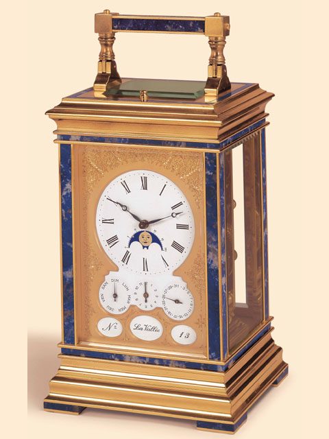La Vallée, Swiss, movement by Matthew Norman, No 13 of a limited series of 400, circa 1982. Fine gilt brass and lapis lazuli eight-day going astronomical hour and half-hour striking calendar clock with alarm, hour-repeating, and phases of the moon in original leather fitted box. Accompanied by certificate of origin and manual.