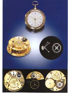 th century watch. Lever escapement of experimental type withighly polished steel wheel of "flat wheel cylinder" type, the lever with simple pointed pallets, one jewelled, the other steel. The banking is achieved with extensions to the pallet arms which stop on top of the escape wheel teeth. There is apparently no draw on the pallets. The fork and roller action simply consists of two independently friction-mounted "D" section pieces on the staff, rotatable so that the shake in the fork can be adjusted closely. Plain gilt brass three-arm balance with two sall steel poising screws eccentrically mounted, and inset in the rim. Blued steel balance spring with a long straight tail, controlled by curb pins to effect the corrections for temperature changes by means of "Chelsea Bun" type compensation, the curb is mounted on a sliding steel frame, which can be racked sideways to adjust the watch for meantime, by moving the curb pins along the tail of the balance spring. Diam. 54 mm.