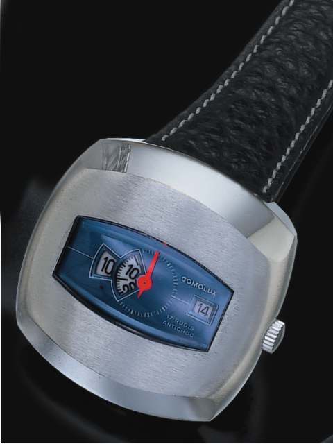 Comolux. Produced in the 1960's. Unusual jump hour, water-resistant, "carré galbé", stainless steel gentleman's numerical and analogical wristwatch with date.
