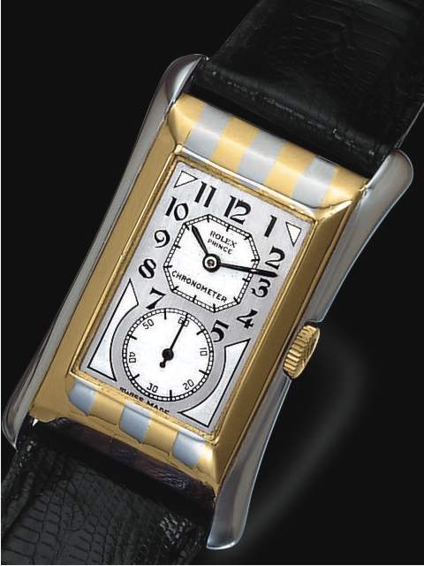 Rolex "Prince Brancard" Chronometer, Ref. 971, 1930's. Very fine rectangular curved, flared, 18K white and yellow gold gentleman's wristwatch with an 18K pink gold buckle.