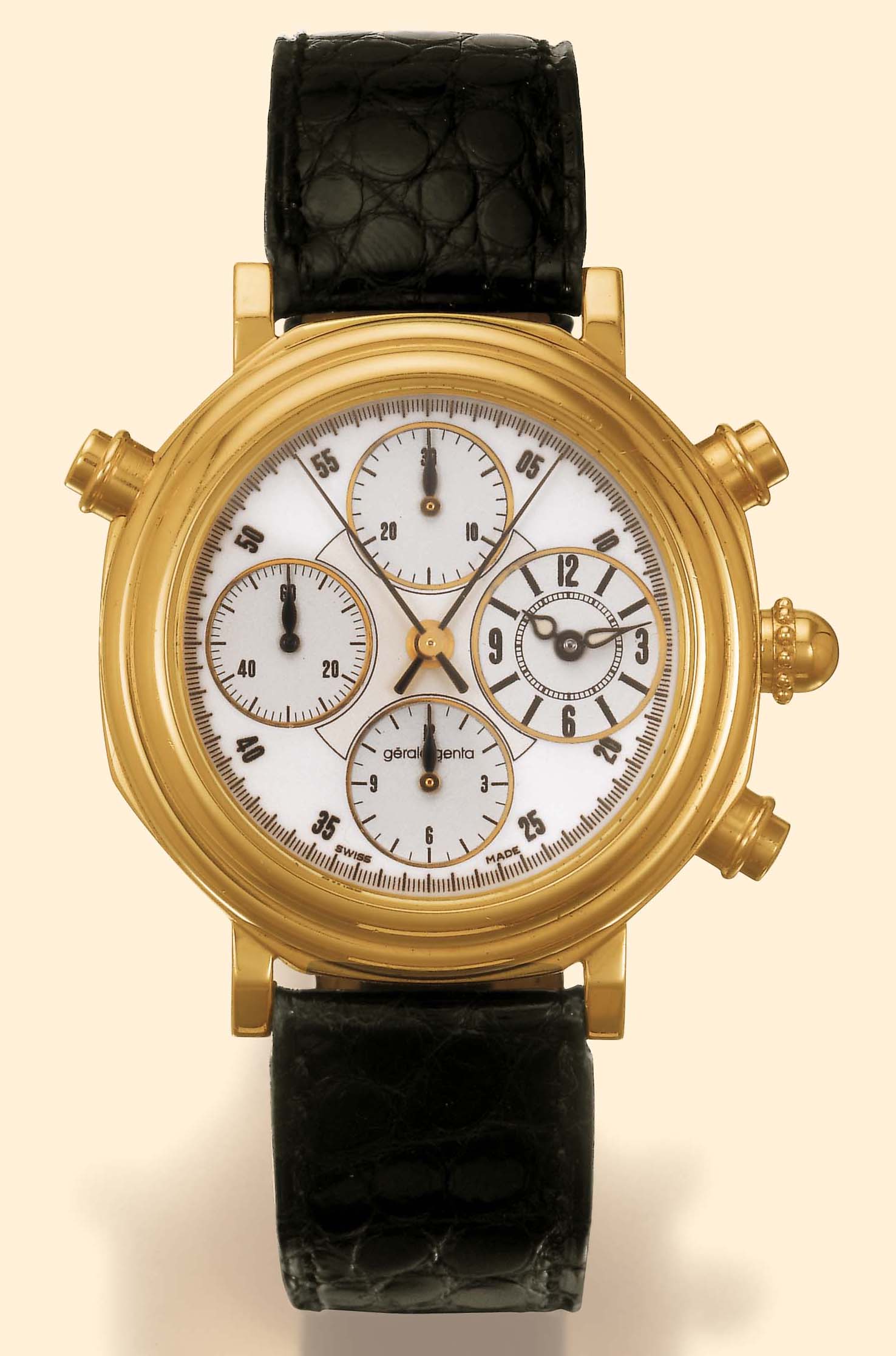 Gérald Genta, Genève, Automatic, N°/25, Ref. G 3580. 7. Made in 25 examples in 1996, sold on April 2, 1996. Fine, water-resistant, self-winding 18K pink gold gentleman's wristwatch with round button split-seconds chronograph, registers and tachometer, with leather strap and 18K pink gold Gérald Genta buckle. Accompanied by fitted box and waranty.