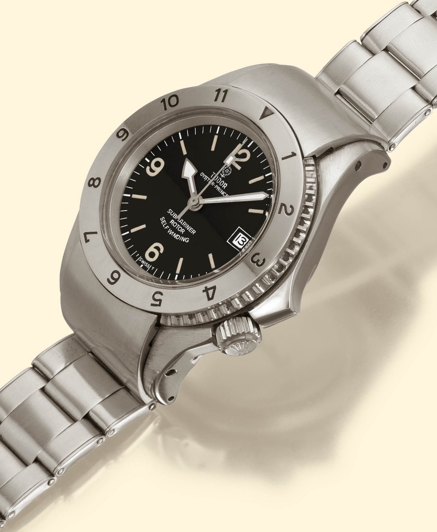 "U. S. Navy Prototype" Tudor, Oyster Prince, Submariner, Rotor, Self-winding, Ref. 7754, case N°22751. Prototype made in few examples in 1982, for the US Navy, production was never undertaken. Exceptionally rare and very fine, asymmetrical, center-seconds, self-winding, water-resistant, stainless steel military wristwatch with stainless steel Oyster bracelet.