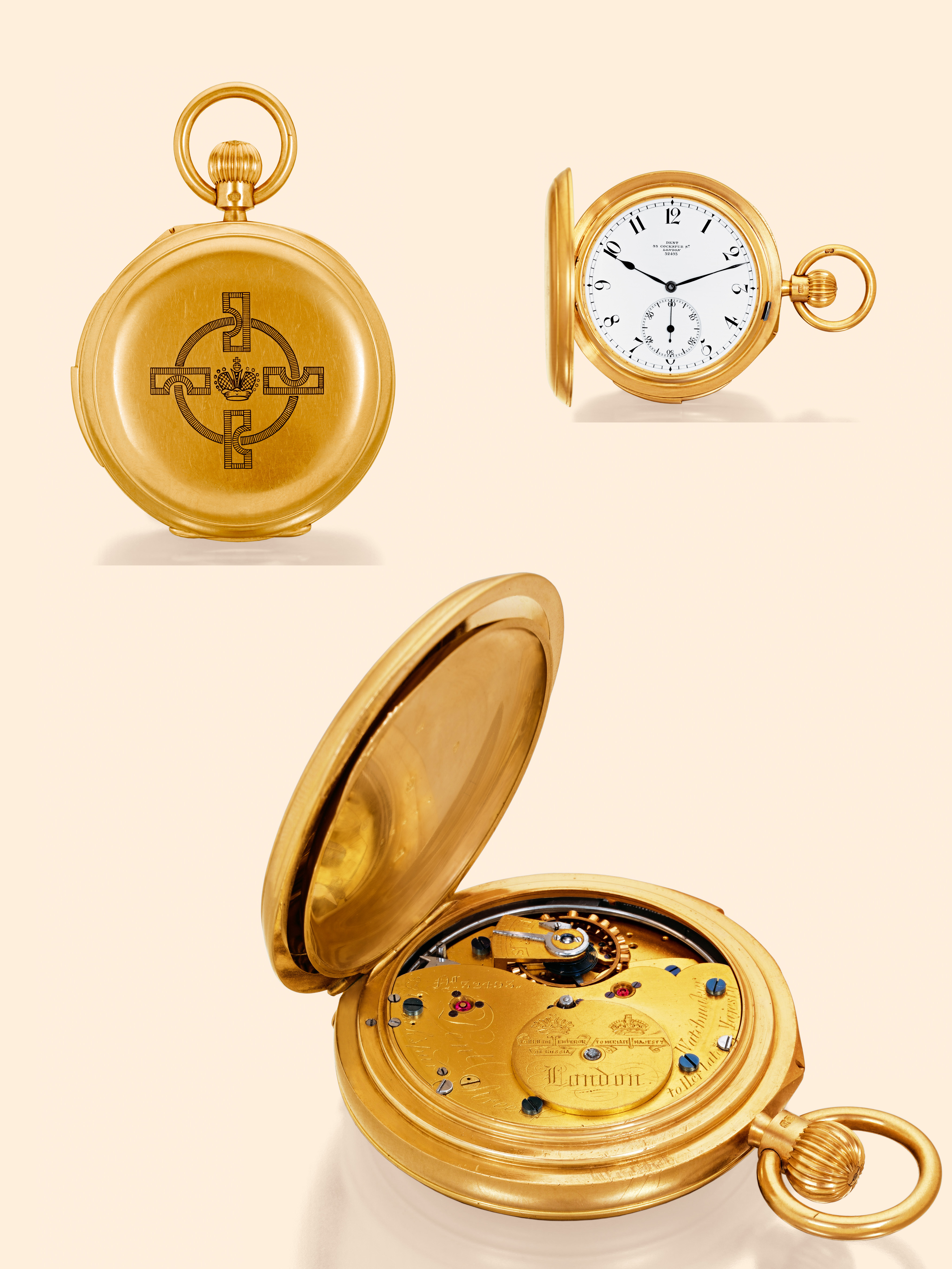 “To Prince Orloff” Dent, London, N°2493, formerly the pro-perty of Prince Orloff. London hallmarks for 1893-1894. Extremely fine and rare, large 18K yellow gold and enamel minute-repeating hunting-cased keyless pocket watch.