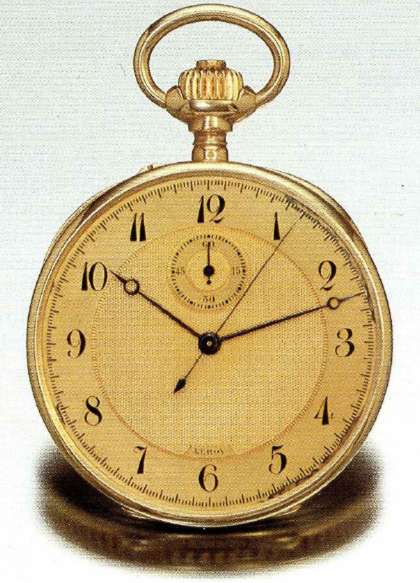 L. Leroy & Cie. , Horlogers de la Marine, 7, Boulevard de la Madeleine, Anciennement 13-15 Palais Royal, N°1835, circa 1900. Fine and elegant 18K gold keyless watch with chronograph and instantaneous 60 minutes recorder.