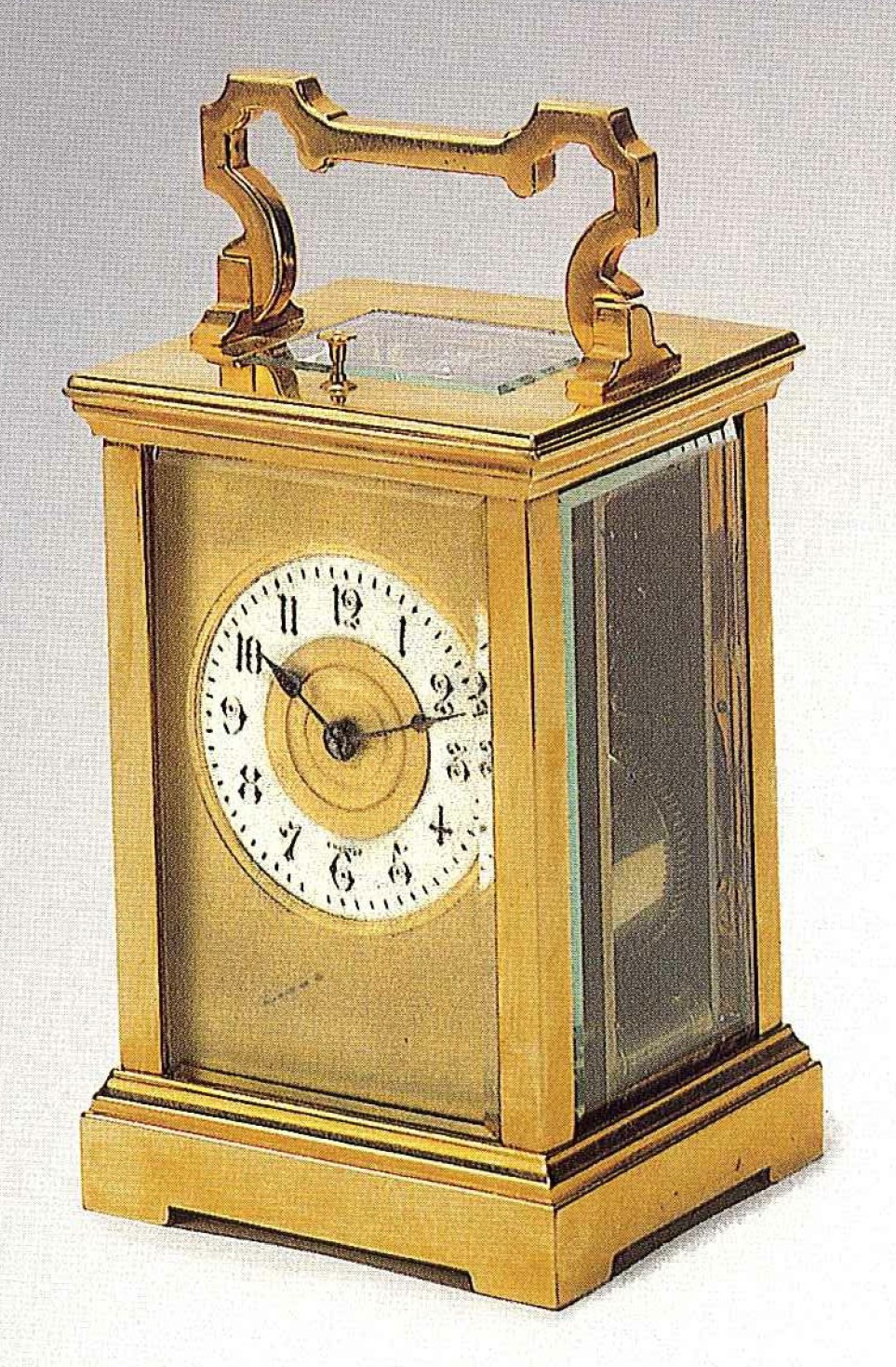 C. Gilt bronze, "Anglaise", glazed four faces and top. D. Egg-shell enamel chapter ring with fancy Arabic numerals. Blued steel "pear" hands. Gilt satine dial plate. M. Gilt brass rectangular with going barrels both for the going and the striking trains, silvered platform with cylinder escapement, plain brass threearm balance, flat balance spring, striking and repeating on gongs with button at the top. Dim. 12, 5 x 8, 5 x 7, 5 cm, excluding the handle. c 2-4 D 22-54 M 4 C Estimate: SFr. 1'200 - 1'500