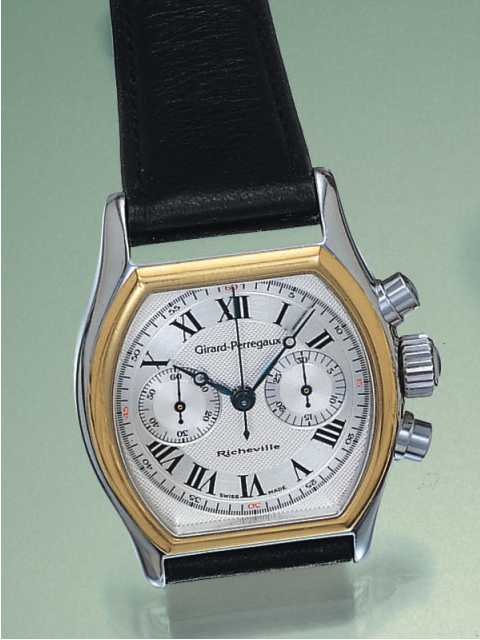Girard-Perregaux, "Richeville", No. BJ-243, Ref. 2710. 55. Produced in the 1990's. Fine, water-resistant, tonneau-shaped, 18K yellow gold and stainless steel gentleman's wristwatch with round button chronograph and register, and an 18K yellow gold and stainless steel Girard-Perregaux buckle.