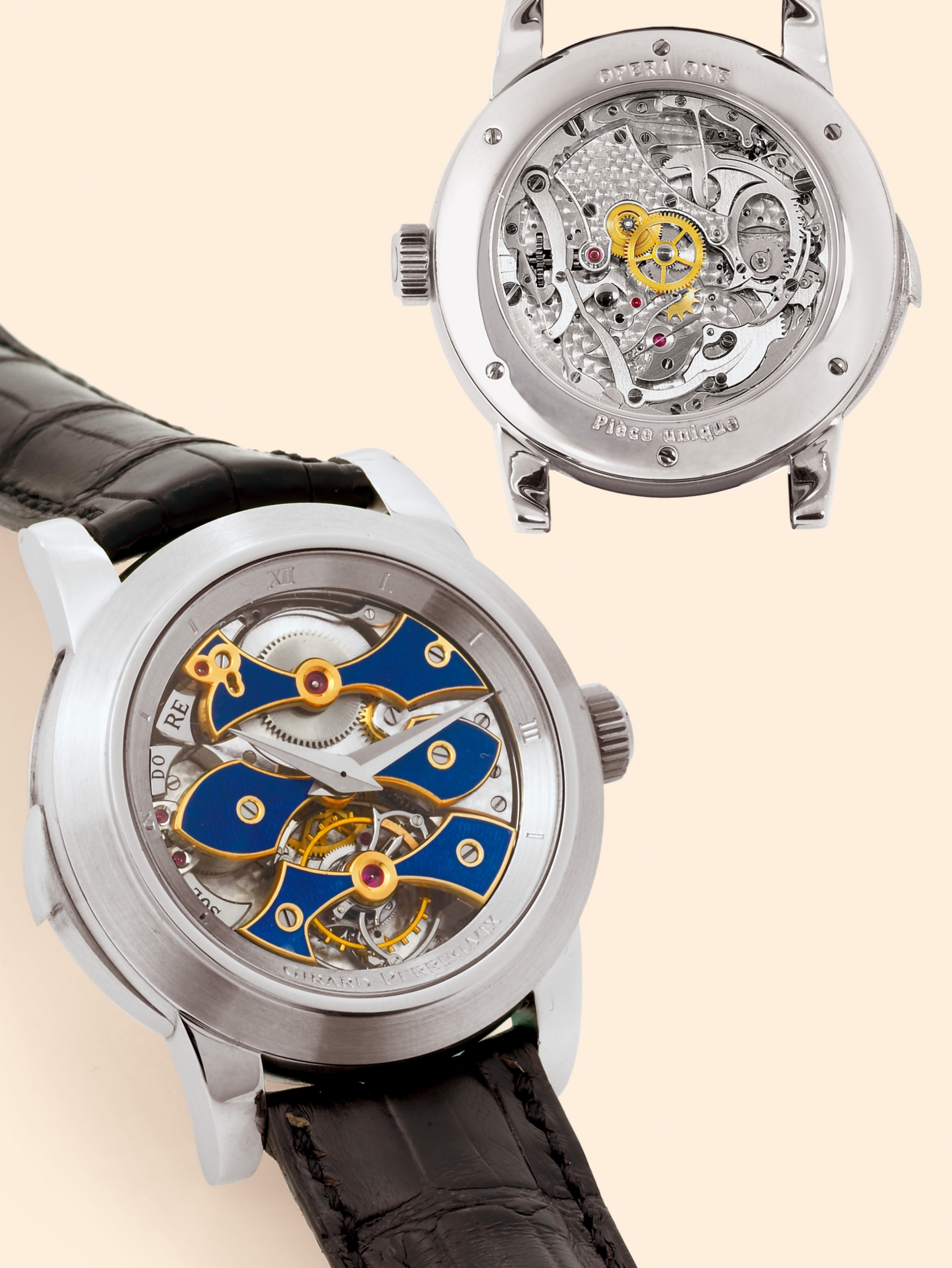 “Unique Opera One” Girard-Perregaux, La-Chaux-de-Fonds, "Opera One - Piece Unique – Carillon ‘Westminster’ Minute Repeater with Tourbillon and 3 enameled gold bridges”. Made in 2000. Extremely fine and important, Carillon ‘Westminster’ minute-repeating, platinum gentleman's wristwatch with visible one-minute tourbillon regulator under 3 enameled 18K gold bridges and an 18K white gold Girard-Perregaux deployant clasp. Accompanied by a fitted box and certificate.