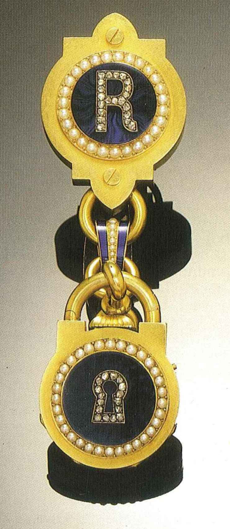 C. Four body, in form of a padlock, the cover with a diamond-set key hole over a black enamel ground with a split-pearl set frame. Matching châtelaine the clip with a diamond-set "R" instead of a key hole. Gold cuvette with engine-turned border. D. White enamel with Roman numerals. Blued steel Breguet hands. M. 11"', gilt brass, 8 jewels, cylinder escapement, plain brass threearm balance, flat balance spring. Signed on the dial and cuvette. In very good condition. Dim. 145 x 34 mm.