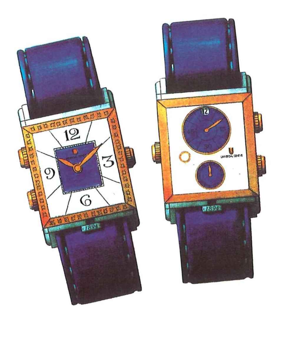 C. massive, polished, outer case in platinum, on the top lug, at 12 o'clock, rotating system for the " cabriolet", on the back, the Universal Watch logo and the effigy of "Janus", inside, the dedication "100 ans de tradition horlogère, 1894-1994, Modèle unique". Bezel set with 50 diamonds. Inner case in 18ct pink gold, bearing two crowns on one side for the separation of the functions, and one on the other side to adjust ail the functions of both dials, screwed bars. At 6 o'clock, a platinum boit engraved on one side : 1894 and on the other one 1994, serving in the same time to fix the inner case to the platinum body. D. on one side, white with blue mother of pearl center with painted Arabic numerals and indexes. Feuille pink gold hands. On the other side, white with blue mother of pearl auxiliary dials with painted Arabic numerals and indexes for the minutes and the seconds, apertures for the jumping-hour and the diurnal and nocturnal hours. M. 8 3/4"' cal. 42, rhodiumed, 17 jewels, lever escapement, Glucidur balance adjusted to 3 positions, Incabloc system, selfcompensating flat balance-spring. Dial, case and movement signed. In mint condition. Dim. 26, 5 x 43 mm.