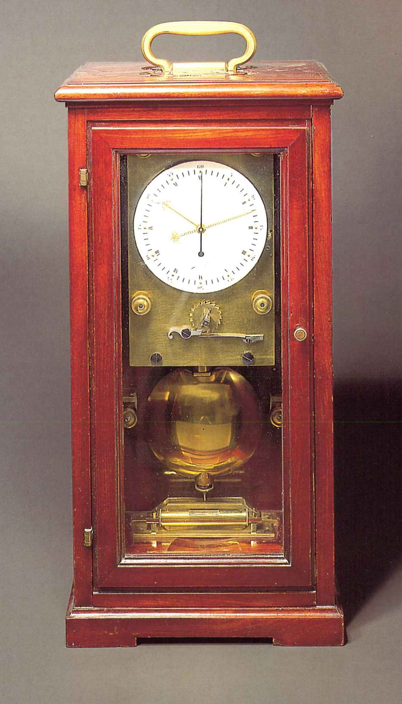 C. Solid mahogany, with moulded base and pediment, spring-loaded glazed front door, designed to be easily transported with a recessed folding handle on the top. The movement and the pendulum are mounted on an "L" shaped solid mahogany bracket which can be slid out of the travelling case, its base, set with a pendulum guard and a spirit level, is inlaid with a brass screwed plaque, engraved: "Régulateur N°53 - Echappenient libre perfectionné". D. White enamel with Roman numerals, outer Arabic minute ring and gold inlaid dots as five minute divisions, signed "Coteau" below "30". Gilt brass fine and elaborate hands and counterpoised blued-steel centre-seconds hand. M. Brass, spring driven, with a double frame, the larger for the extra large going-barrel, surmounted with a shaped lower one for the train of wheels and the delicate spring remontoire, which is controlled by a fly regulator. Set on the back plate of the lower cage, the most unusual escapement, based on the pivoted detent escapement, allowing a dead-seconds beating hand with a half-seconds beating pendulum (a small pivoted and spring loaded lever with jewelled pallet, operates as a pivoted detent acting on the pendulum as it swings in one direction only, the impulse given via a small roller). The nine rod grid-iron, half-seconds beating pendulum with spring blade suspension is supported by a solid brass bracket. Two bolts on either side of the suspension can clamp the top of the pendulum for transport, while the bob is secured by two further pivoting clamps. The movement itself is fixed on the bracket, supported by four turned brass pillars extending from plates let into the mahogany backboard and is secured in position by knurled nuts. Signed on the dial, numbered on the back plate. In very good condition. Dim. 42, 5 x 21, 5 x 16, 5