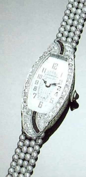 Bex Watch Co. , 1920's. Very fine "Art Déco", oval, platinum, sapphires and diamonds Iady's wristwatch with four rows pearls bracelet.