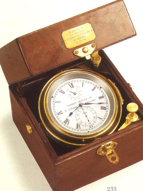 Thomas Mercer, Ltd. London, N°9851, circa 1950. Fine mahogany two-day marine chro-nometer with winding indicator.