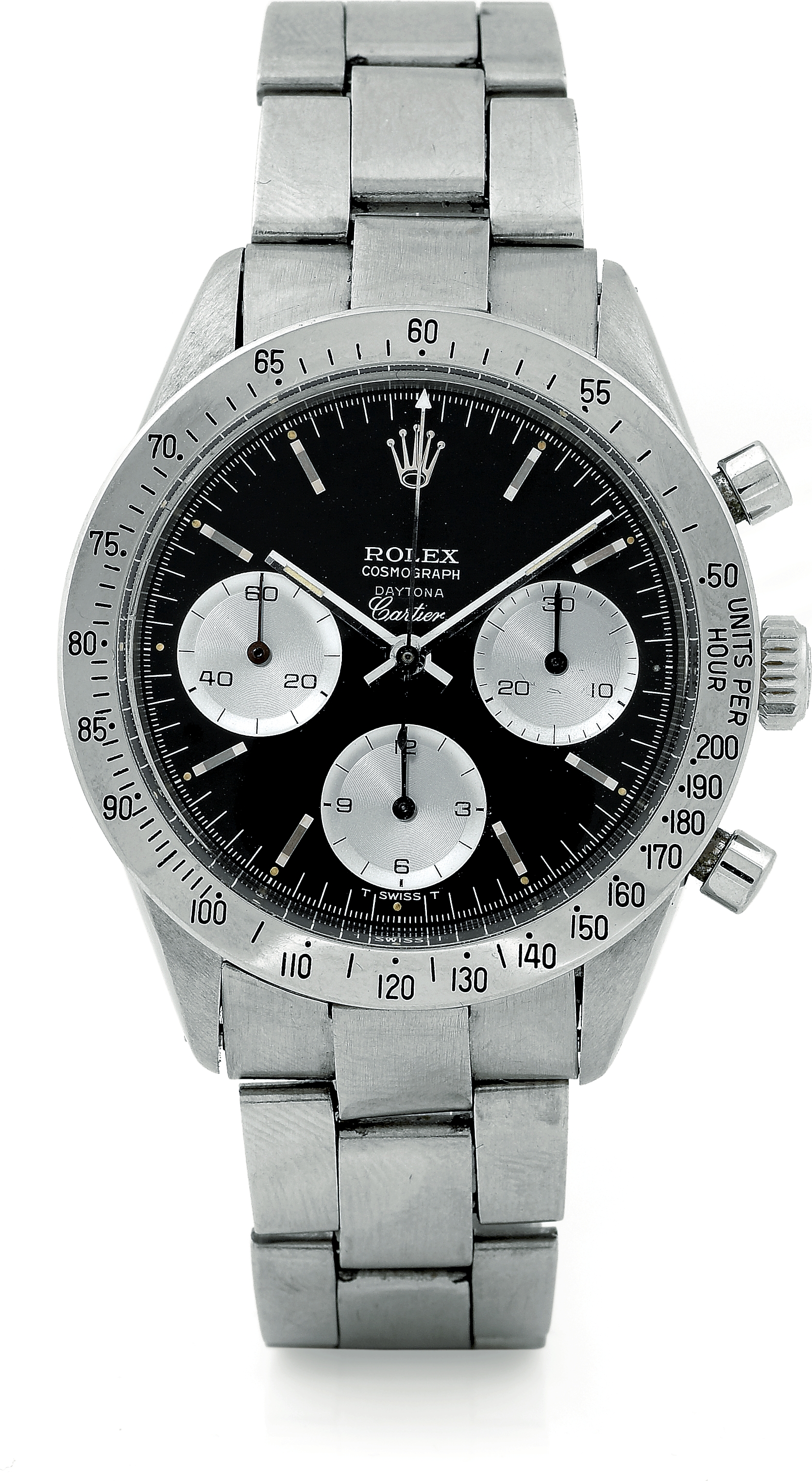 Ref 6239, Retailed by Cartier Rolex, “Cosmograph Daytona”, Ref. 6239, retailed by Cartier. Made in the early 1960s. Very fine and rare, water-resistant, stainless steel wristwatch with round button chronograph, registers, tachometer, steel bezel graduated to 200 units per hour, and a stainless steel Rolex Oyster bracelet.