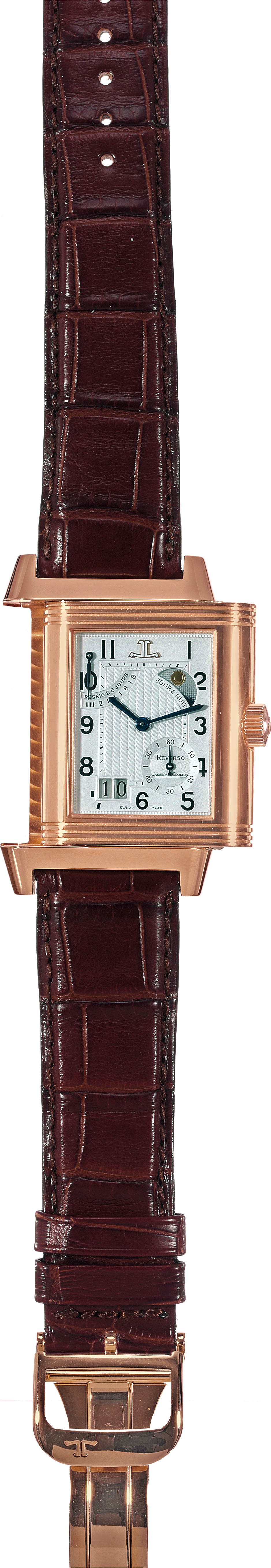 Reverso Septantième Jaeger-Le Coultre, "Reverso Septantième - 8 Days", N°4/ 500, Ref. 240. 2. 19. Made in a limited edition of 500 pieces to commemorate the 70th anniversary of the legendary "Reverso" model in 2002. Very fine and rare, large, rectangular and reversible, 18K pink gold wristwatch with large date, 8-day power reserve, night and day indication and an 18K pink gold Jaeger-LeCoultre deployant clasp. Accompanied by a certificate and manual.