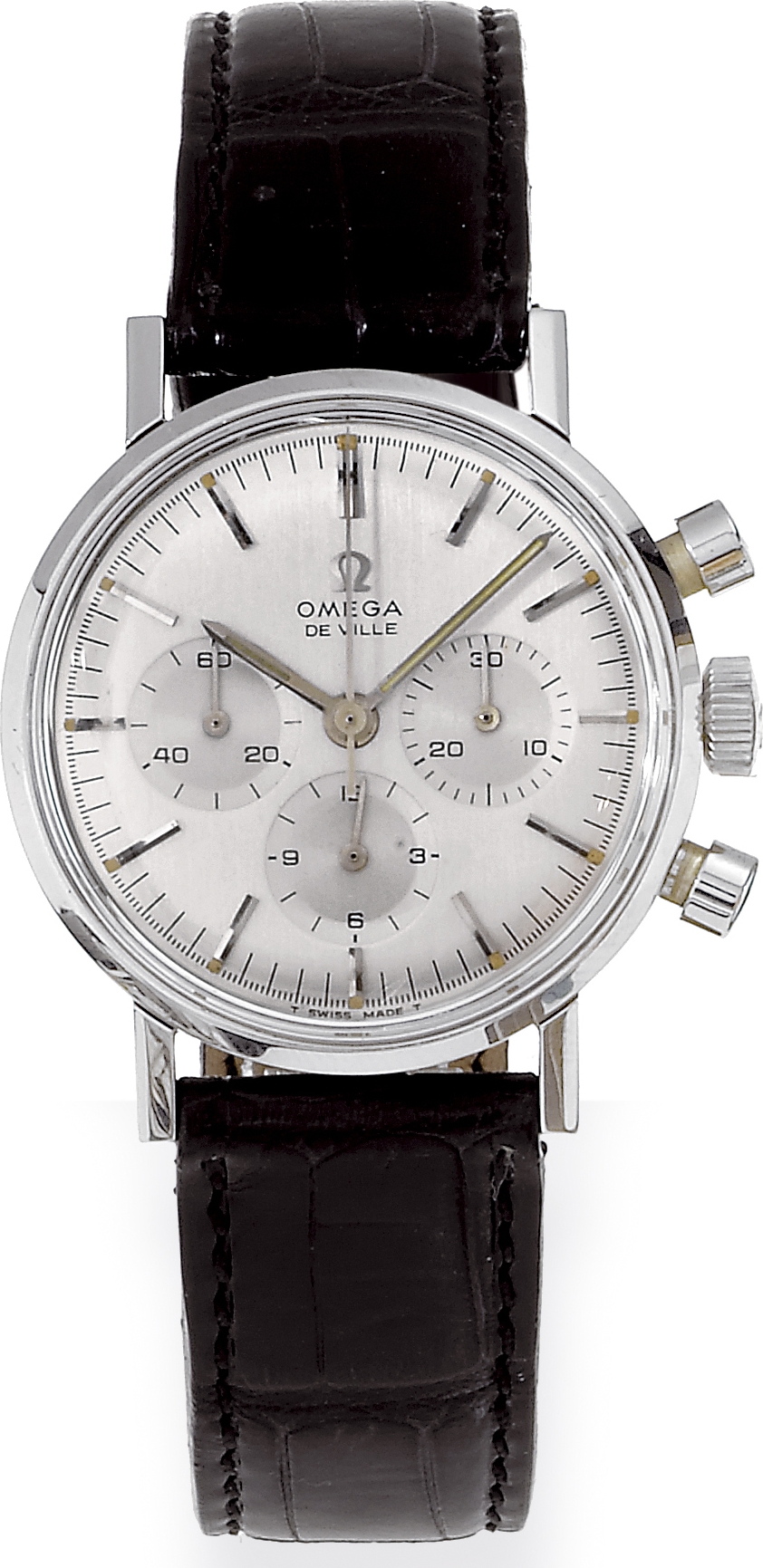 De Ville Chronograph Omega, “De Ville Chronograph, ” N°6544004, Ref. ST 145. 005-67. Made in the 1970’s. Fine and rare, water-resistant, stainless steel wristwatch with round-button chronograph, registers and a stainless steel Omega buckle.
