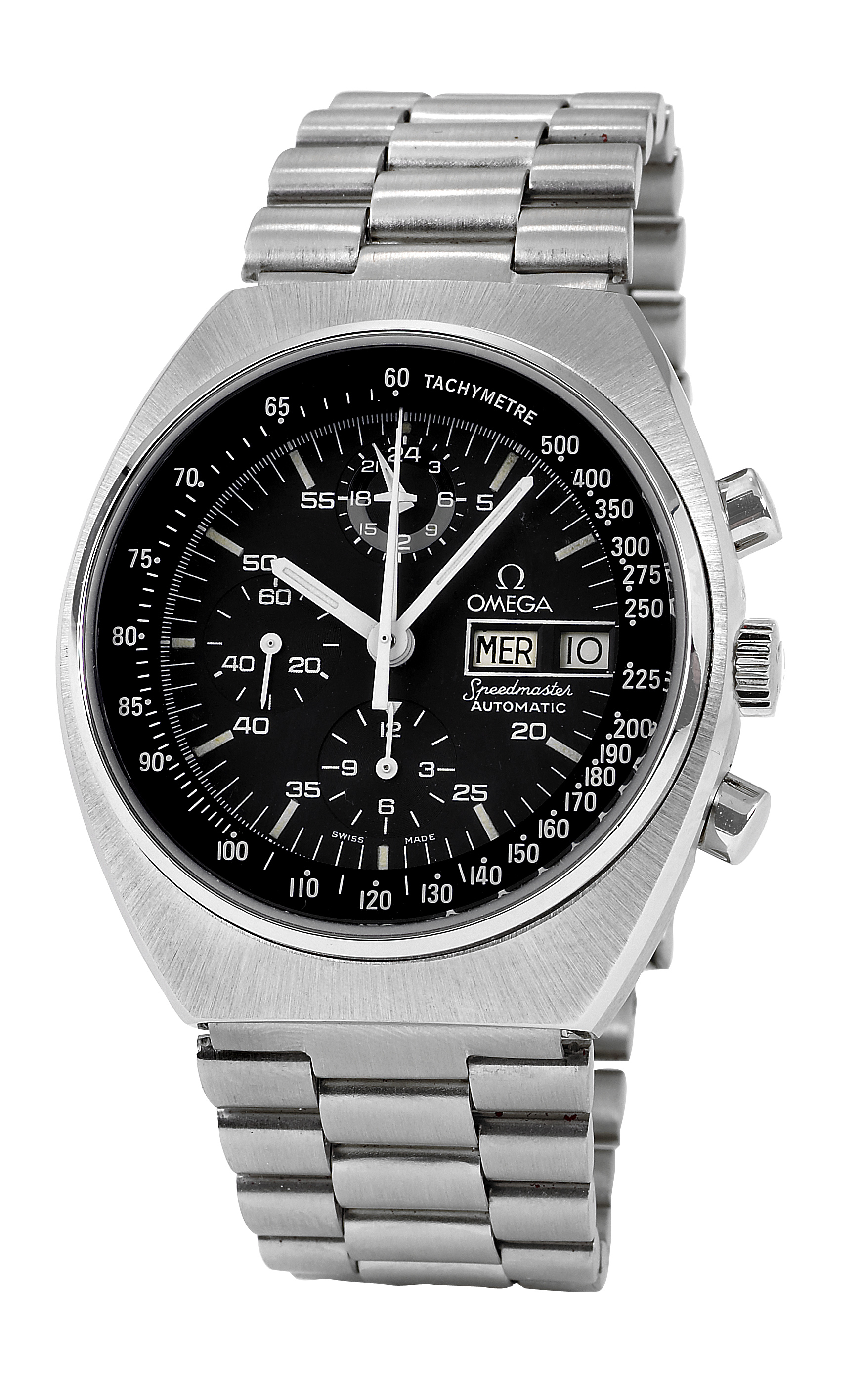 Mark IV Omega Speedmaster, Automatic, N°5541936, Ref. 176. 0012. Made in 1974. Fine and rare, tonneau-shaped, self-winding, water-resistant, stainless steel wristwatch with day, date, round button chronograph, 12-hour register, central minute recorder, tachometer, the 24 hours with night/day indication, and a stainless steel Omega bracelet with deployant clasp. Accompanied by a fitted box and certificate.
