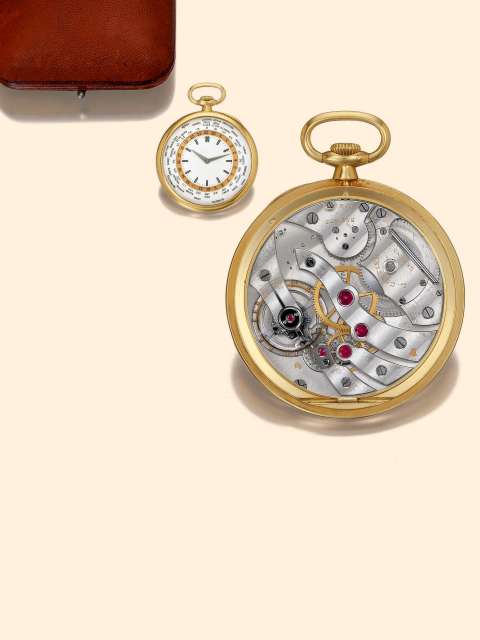 C. Four-body, "bassine", polished, gold hinged cuvette. D. Matte, silvered, outer Arabic revolving chapter ring for 24 hours, World Time chapter ring bearing the name of 32 major cities around the world according to the Louis Cottier World Time Patent. Steel "Dauphine" hands. M. 36 mm. (17 1/2’’’), rhodium-plated, 18 jewels, straight line lever escapement, cut-bimetallic compensation balance with blued steel Breguet balance spring, punched with Seal of Geneva quality hallmarks. Signed on the movement. Diam. 44 mm.
