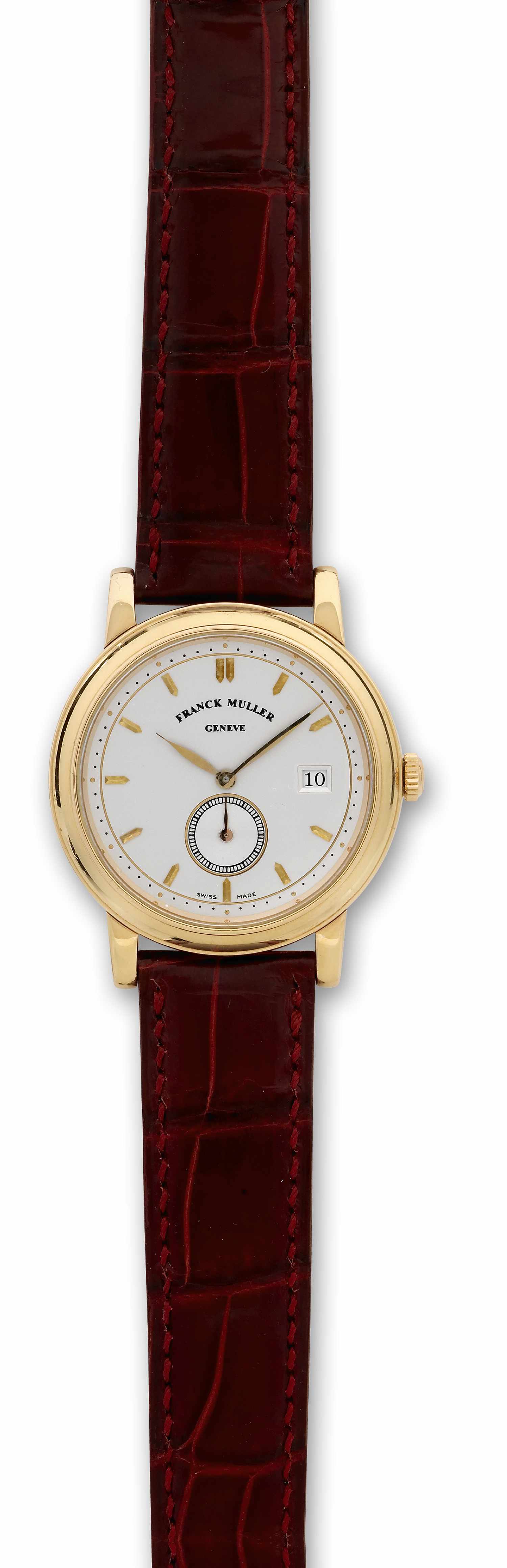 franck Muller yellow gold with date Franck Muller, Genève, N°5, Ref. 2000 AT. Made in the 2000’s. Fine, self-winding, 18K yellow gold wristwatch with date and an 18K yellow gold Franck Muller buckle.