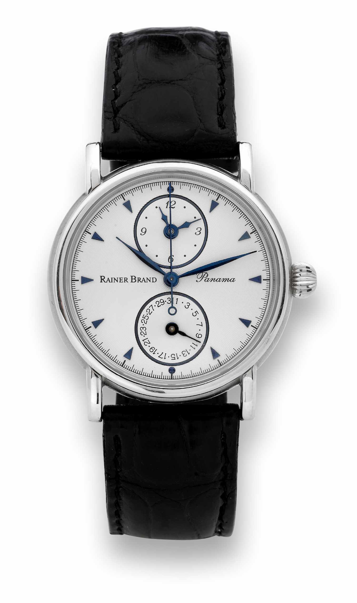 Rainer Brand Steel Two Time Zone Automatic Rainer Brand, German, “Panama” Automatic, N°476, Ref. WMRB 11. Made in the 2000’s. Fine, two time zone, center seconds, self-winding, waterresistant stainless steel wristwatch with date and a Rainer Brand stainless steel buckle.