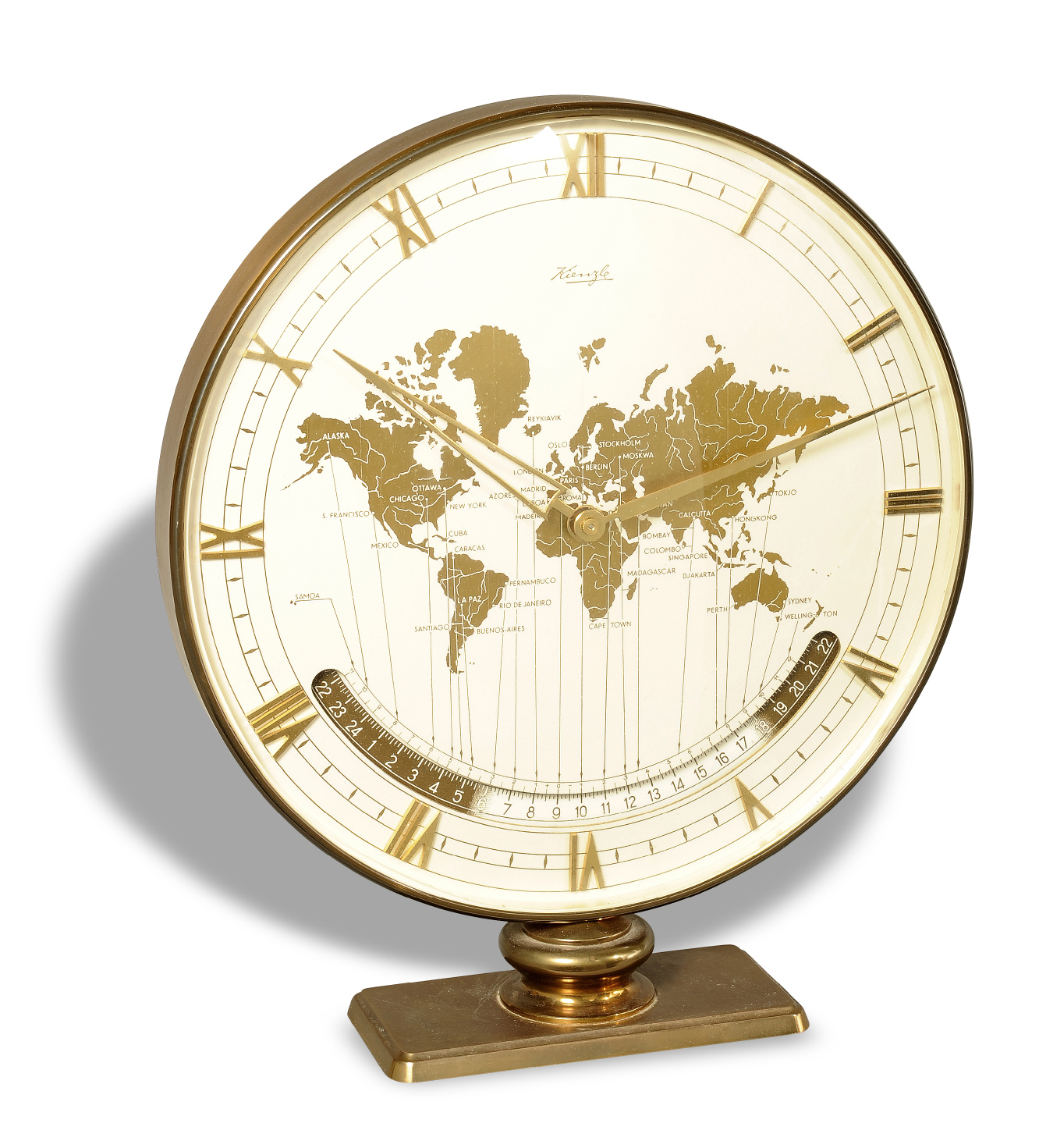Kienzle World Time Clock Kienzle. Made circa 1960. World time, 8-day going desk clock with 24-hour day and night indication.