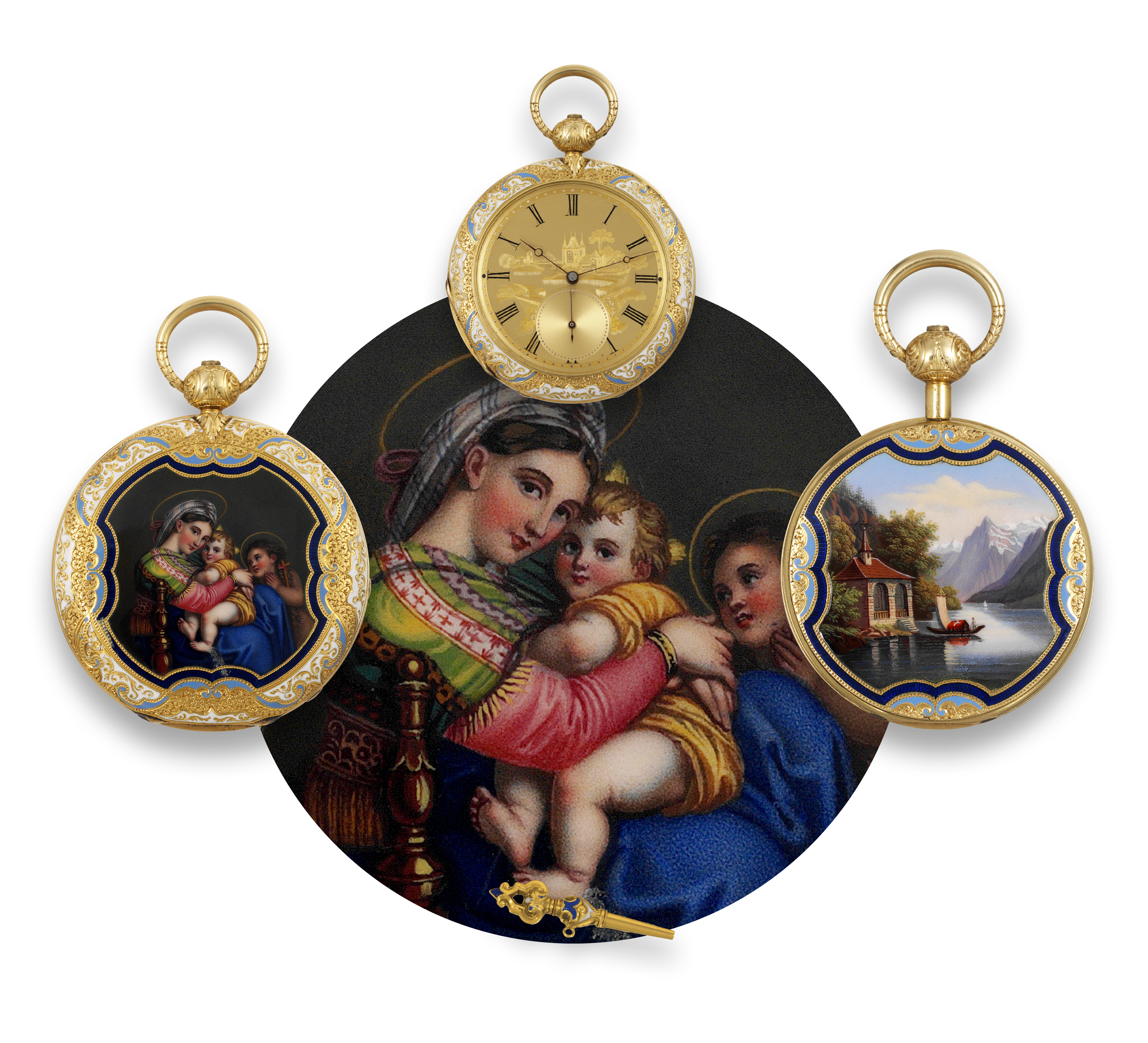 C. Outer: three-body, foliate chased, the back very finely painted on enamel with the Madonna Della Sedia after Raphael within a shaped dark blue enamel border and outer pale blue and white enamel border. Inner: Four-body, the back cover decorated with a very finely painted on enamel alpine lake view, polished bezel and band, foliate engraved pendant and bow. Hinged gold cuvette. D. Gold, line engine-turned with radial Roman numerals, outer dot minute markers, subsidiary seconds, the center finely engraved with riverside buildings. Blued steel Breguet hands. M. 31 mm. , 14’’’, frosted gilt, bar calibre, 8 jewels, cylinder escapement, three-arm flat-rim balance, blued steel flat balance spring, index regulator. Cuvette signed. Diam. 43 mm.