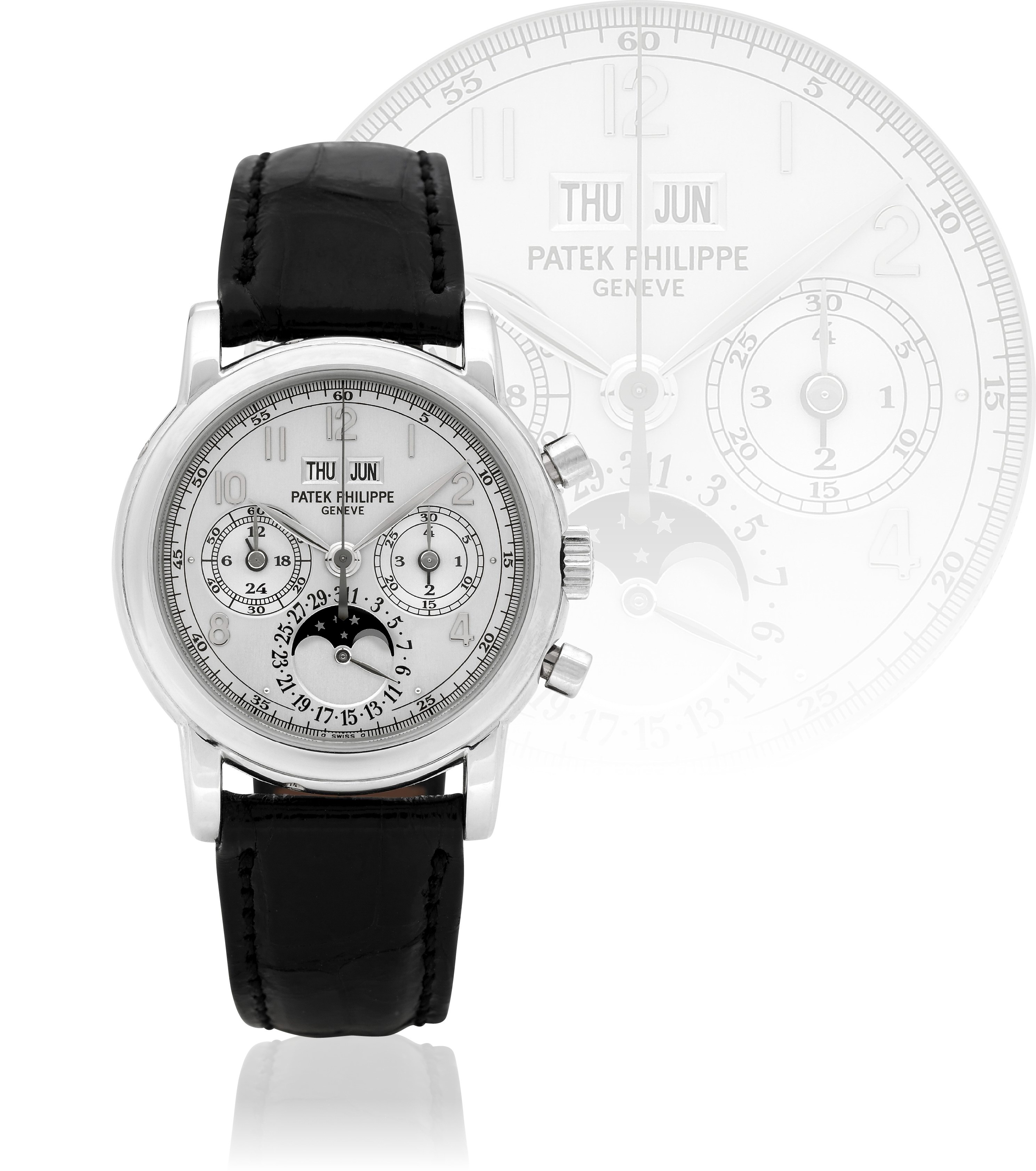 Patek Philippe Ref. 3970 - Platinum – Black Diamond-set dial & Spare 5004 Silver Dial Patek Philippe, Genève, N°046455, case N°153820, Ref. 3970 EP. Made in 2001, sold April 12th, 2002. Very fine and important, water-resistant, platinum wristwatch with round button chronograph, register, perpetual calendar, moon phases, leap year, 24-hour indication and a platinum Patek Philippe deployant clasp. Accompanied by the original fitted mahogany box, Certificate of Origin, setting pin, booklet, spare solid platinum case back and a spare 5004 silver dial.