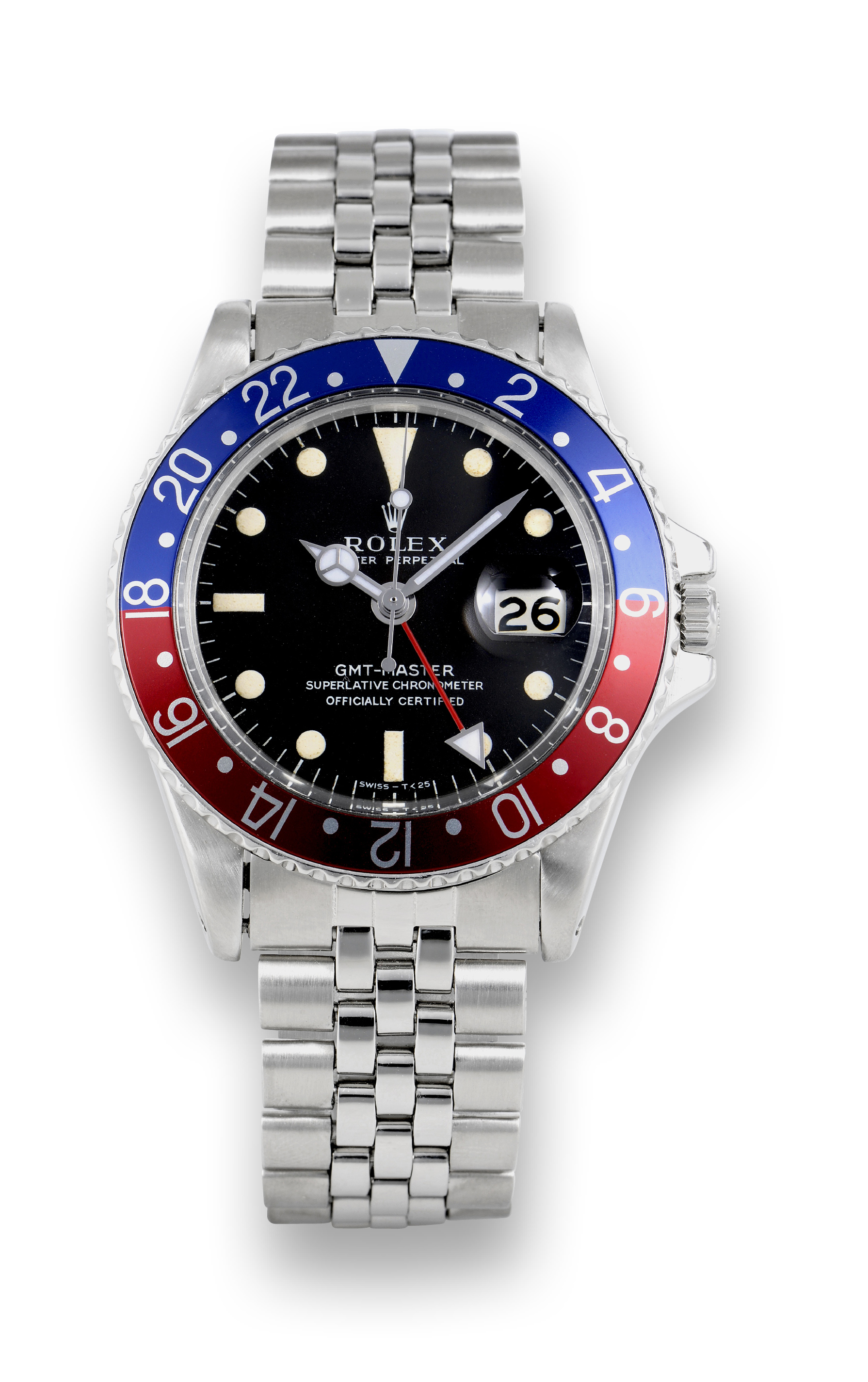 Rolex Ref. 1675 GMT -Master Rolex, "Oyster Perpetual, GMT-Master, Superlative Chronometer, Officially Certified", case N°762800, Ref. 1675. Made circa 1968. Fine, two time zone, center-seconds, self-winding, waterresistant, stainless steel chronometer wristwatch with date, special 24 hour bezel and hand and a stainless steel Rolex Jubile bracelet. Accompanied by the original hands and bezel. The present watch was recently overhauled by Rolex.