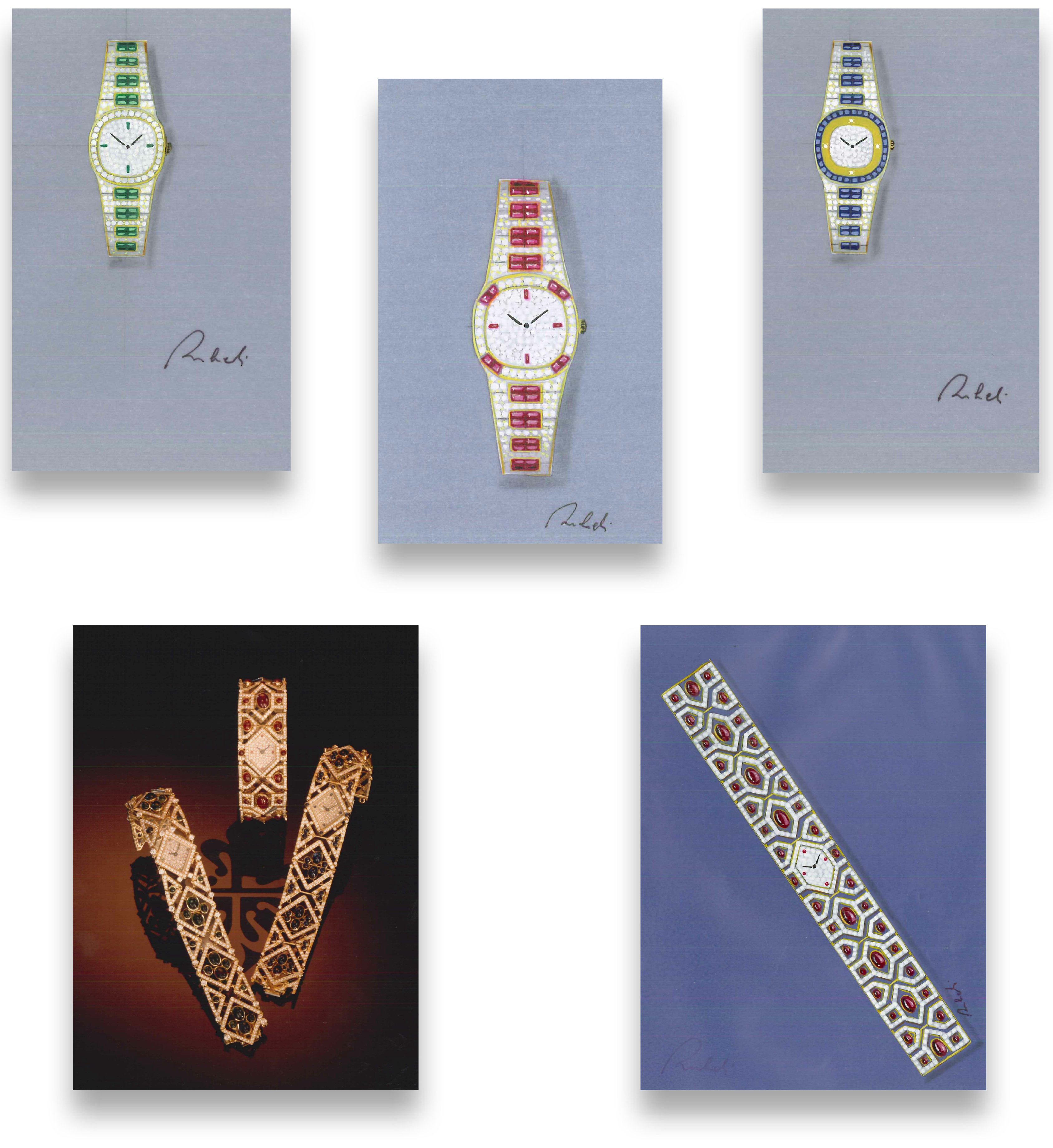 The Photographs: Color prints of diamond and precious stone-set watches, mostly 1970s, including a photograph of the realized pieces of 3 of the original designs in this lot. Photographs of other references including: 4379/2, 4391/2, 4381/3, 3627/2, 3727/3, 3627/1, 3643/1, 3642/3, 4352/4, 4399/1, E2478, 3589/905, 3588/9024469/1, 918/1, 3810. The original drawings signed “Rubeli”. This important document gives insight into the design process at Patek Philippe. Original designs for Patek Philippe watches very rarely reach the open market. The painted gouache designs in this collection are for diamond and precious stone-set versions of the Nautilus and 3 spectacular lady’s bracelet watches. A photograph of these 3 pieces as finally made is included. The cufflink, tie-clip and key-chain designs are for pieces to be sold with a wristwatch as a “set” for gentlemen as evening wear.