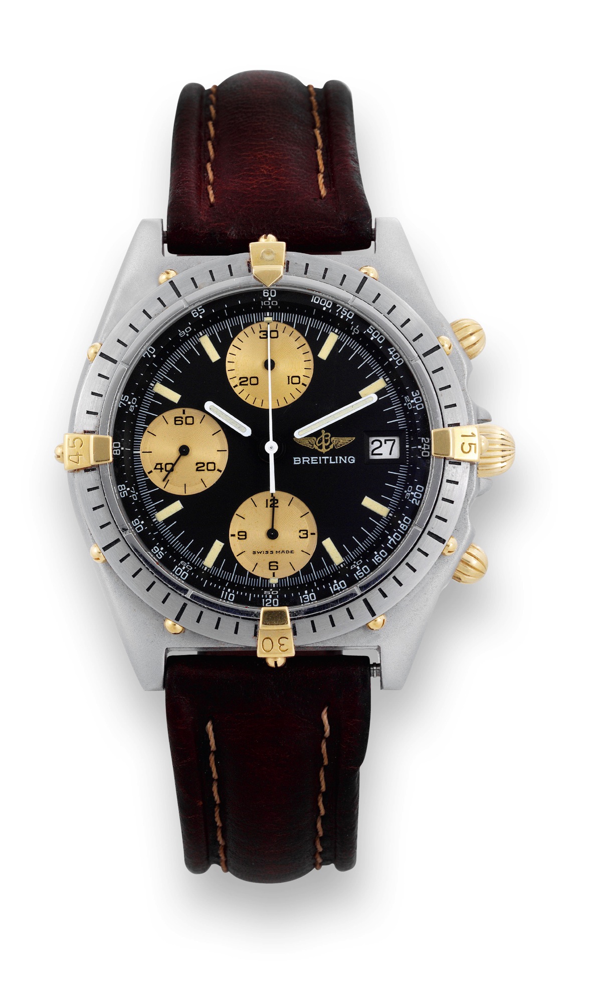 Breitling, "Chronomat". Breitling, Chronomat, case N°4944, Ref. 81. 950. Made in the 1980s. Fine, tonneau-shaped, self-winding, water-resistant, stainless steel and yellow gold wristwatch with round button chronograph, registers, tachometer and date.