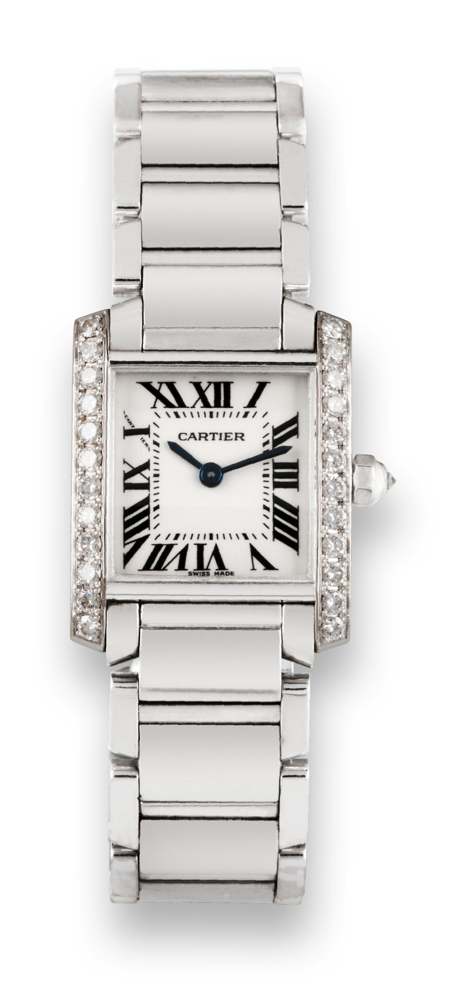 C. Two-body, solid, polished and brushed, flat bezel set with 24 diamonds, case back with 4 screws, sapphire crystal. D. White with painted black radial Roman numerals, Cartier secret signature at X, inner minute divisions. Blued steel épée hands. M. Cal with quartz standardization. Case, dial and movement signed. Dim. 20 x 25 mm. Thickness 6 mm. Approx overall length 165 mm.