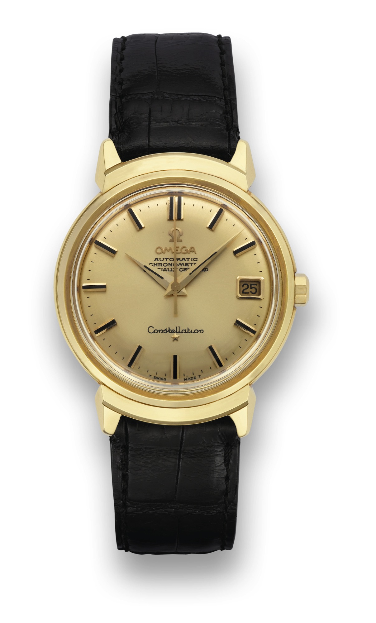 C. Two-body, solid, polished and brushed, stepped bezel, stepped lapidated lugs, screwed-down case back with embossed “Constellation” logo. D. Satiné yellow with applied yellow gold and black baton indexes, outer minute divisions, aperture for the date. Yellow gold and black dauphine hands. M. Cal. 562, copper colored, 24 jewels, straight line lever escapement, monometallic balance, shock absorber, selfcompensating flat balance spring, swan neck regulator. Dial, case and movement signed. Diam. 34 mm. Thickness 10 mm.