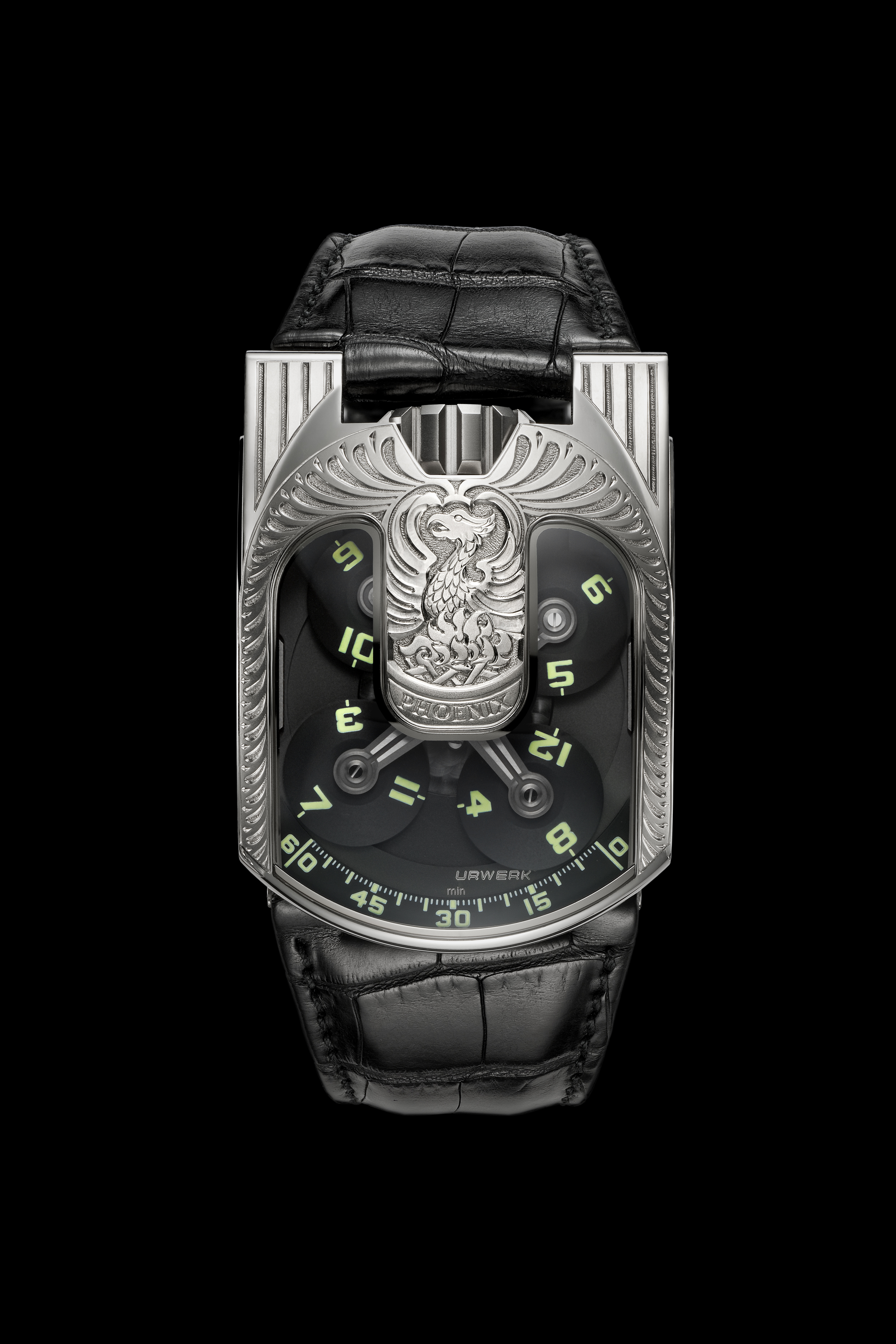 URWERK, "UR-103 Phoenix" for Only Watch URWERK, Genève, “UR-103 Phoenix”. Made in collaboration with the master engraver Jean-Vincent Huguenin, one of the most gifted artists in the field. The very last URWERK UR-103 – UR-103 Phoenix. End of 2010, URWERK stopped production of the UR-103, their landmark timepiece. Especially for Only Watch 2011, the UR-103 rises from the ashes with the pièce unique UR-103 Phoenix. Very fine and unique, futuristic, rectangular, sculpted, water-resistant, 18K white gold and titanium wristwatch with digital time indicated by orbiting hour satellites, control board, power reserve indication and a 18K white gold URWERK buckle. Accompanied by fitted box and Certificate.
