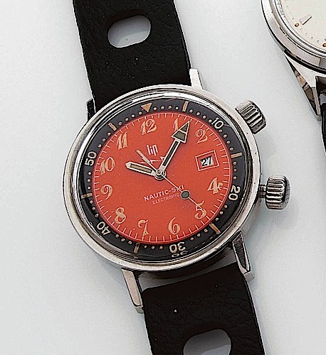 Montre bracelet de plongée en acier, cadran orange, dateur à 3 heures. Mouvement électronique R 184. Stock neuf