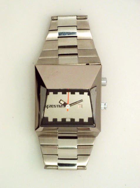 Catena S. A. , "Spaceman". Produced in the 1970's. Unusual and rare center-seconds, self-winding, asymmetrical stainless steel gentleman's wristwatch with date and a stainless steel bracelet.
