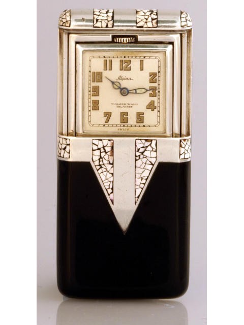 Alpina, retailed by Walser Wald, Buenos Aires. Produced in the 1930's. Fine and rare, keyless, silver and enamel purse watch bearing a hinged sliding mechanism which transforms the watch into a desk clock .