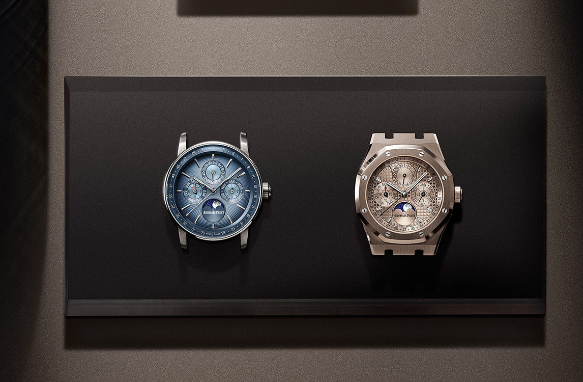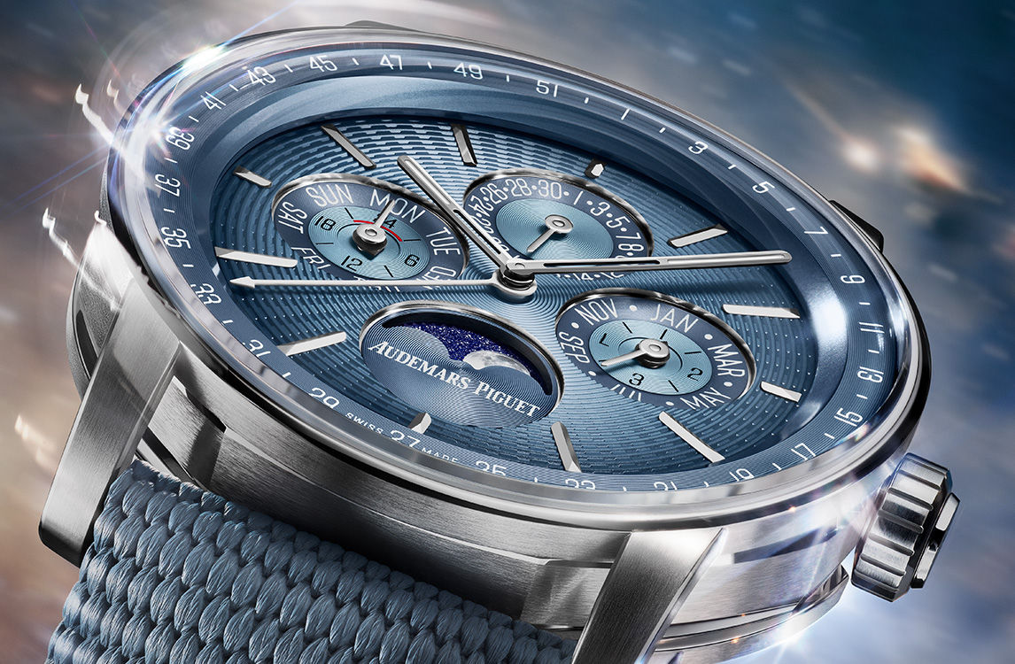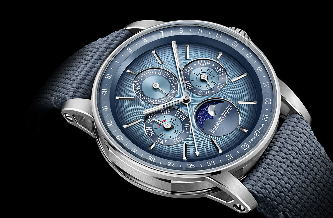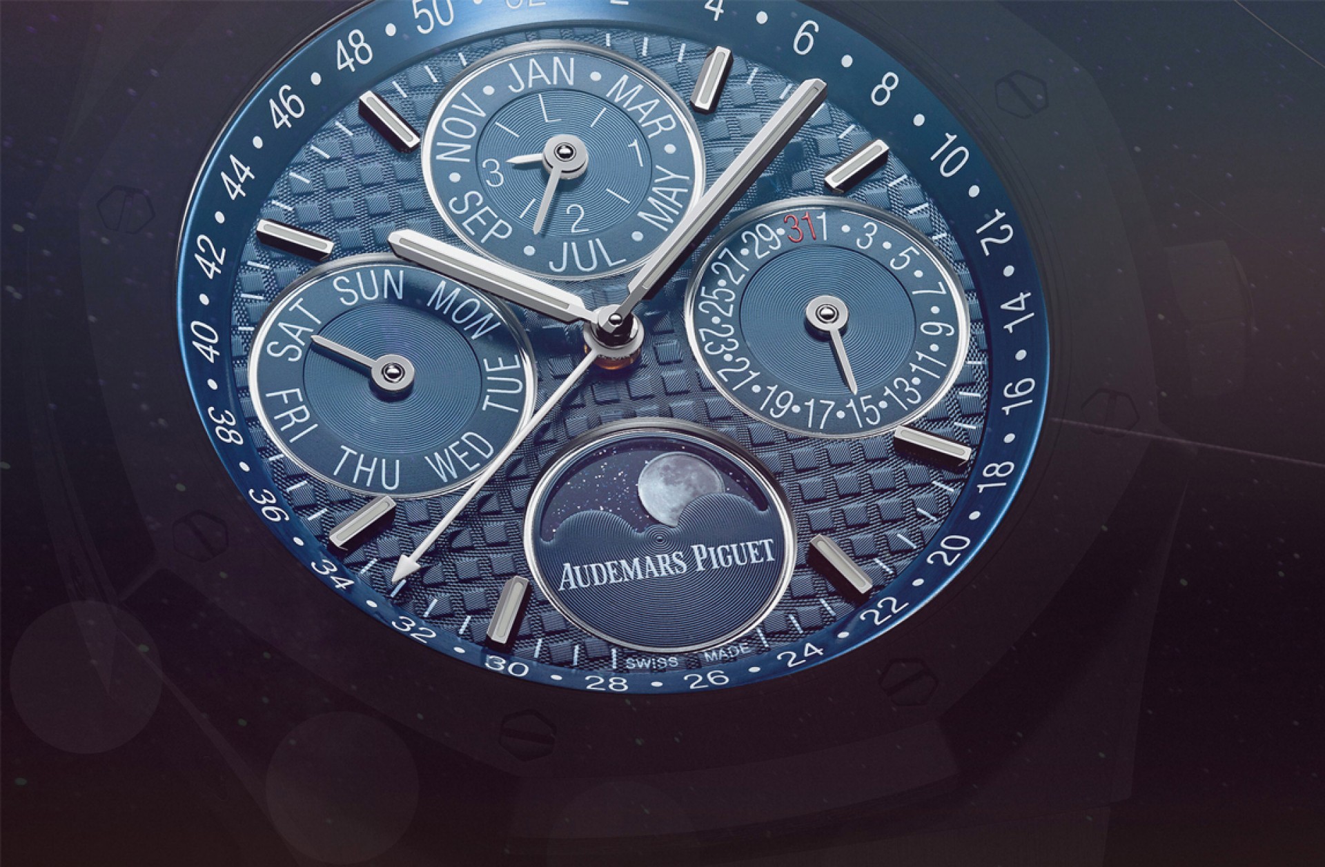 This two-toned wristwatch blending 18-carat white gold with a harmonious blue hue is powered by Audemars Piguet's new selfwinding perpetual calendar movement, providing the watch with enhanced ergonomics and legibility. Featuring three patented mechanisms, Calibre 7138's functions are adjusted solely with the crown, removing the need for additional tools.