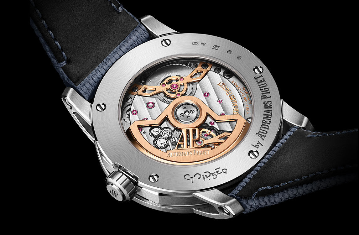 The blue textured rubber-coated strap with calfskin lining is fitted with an 18-carat white gold three-blade AP folding clasp.