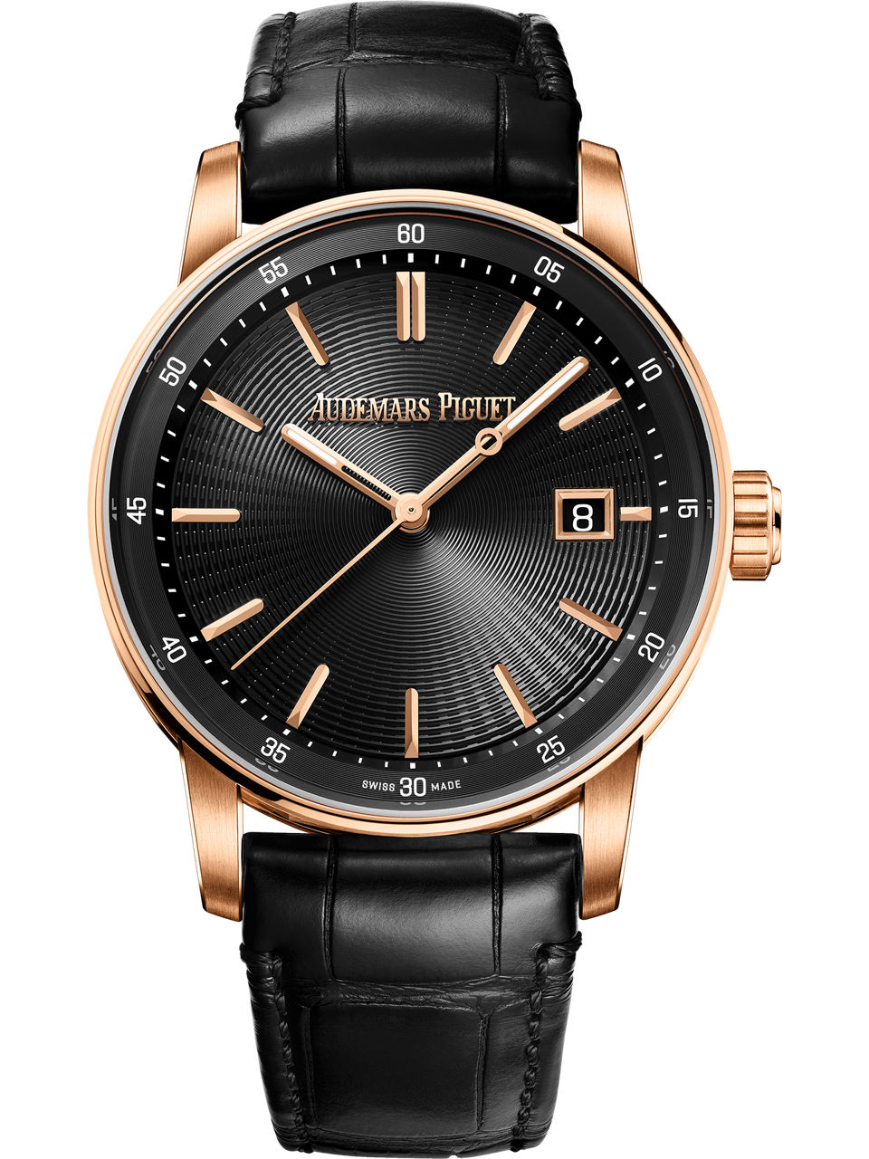The black embossed dial is complemented by 18-carat pink gold hour-markers and luminescent hands, a matching date aperture at 3 o'clock and a black inner bezel.