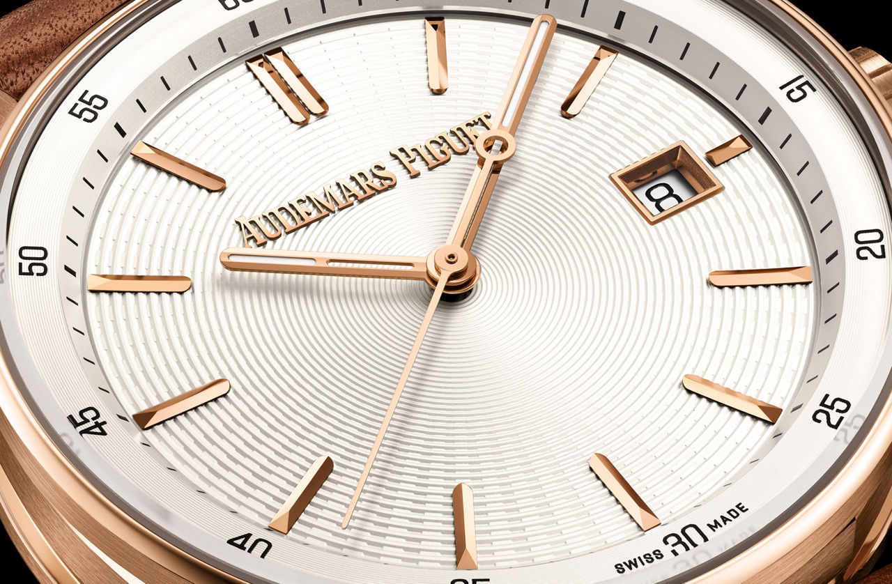 The silver grey-toned embossed dial is complemented by 18-carat pink gold hour-markers and luminescent hands, a white date aperture at 3 o'clock and a silver grey-toned inner bezel.
