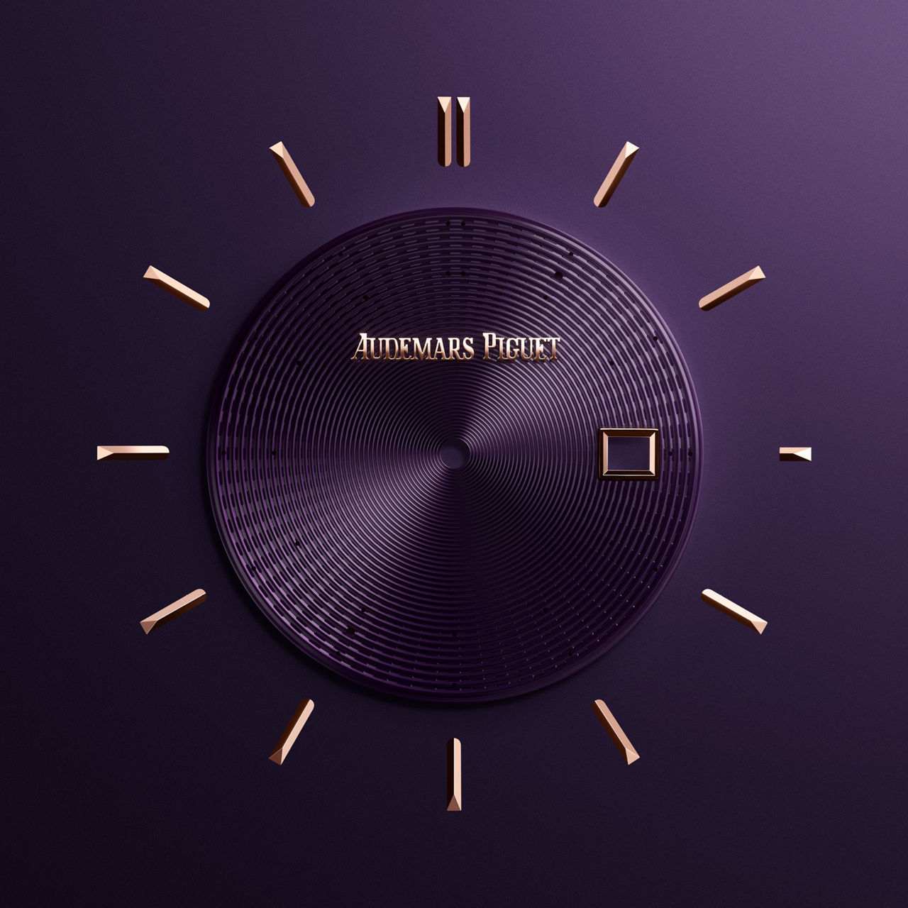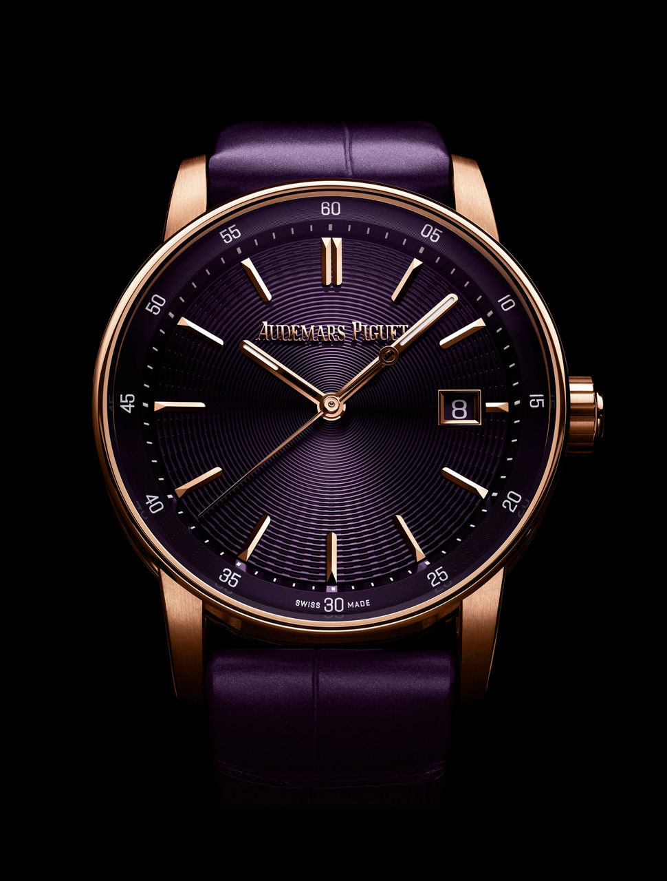 Purple dial, pink gold applied hour-markers and hands with luminescent coating, purple inner bezel.