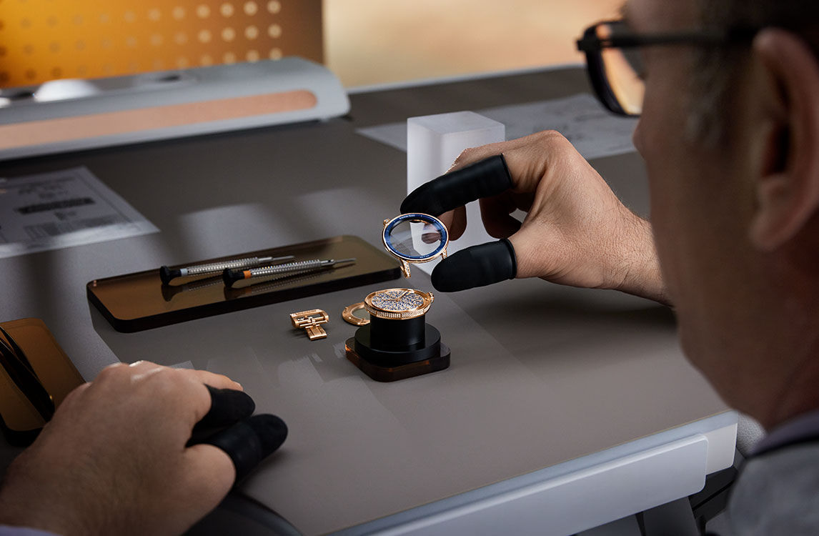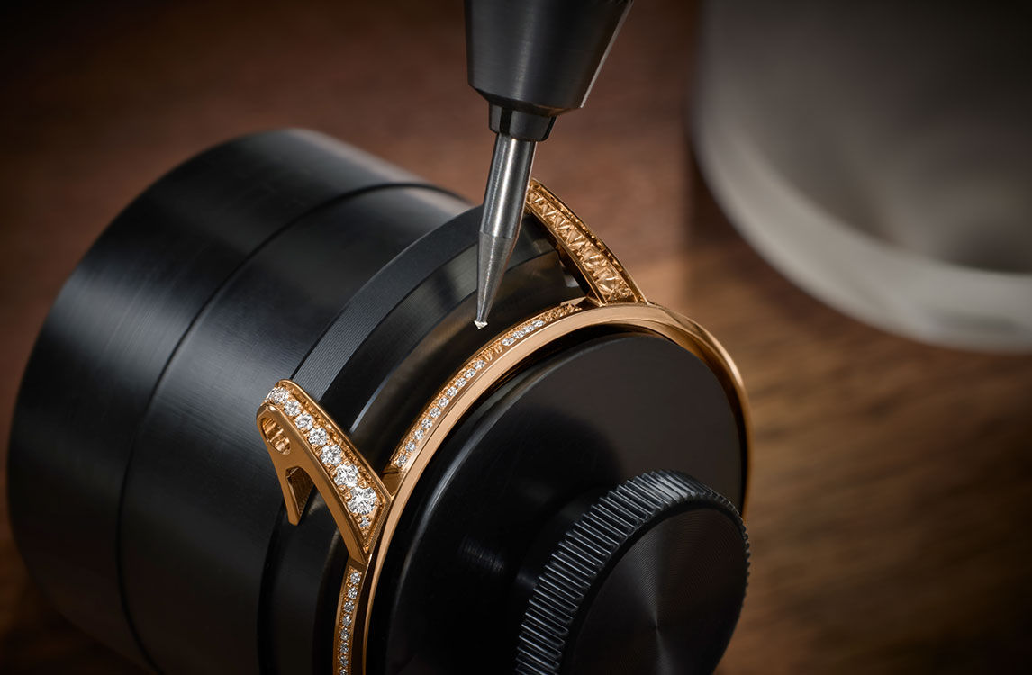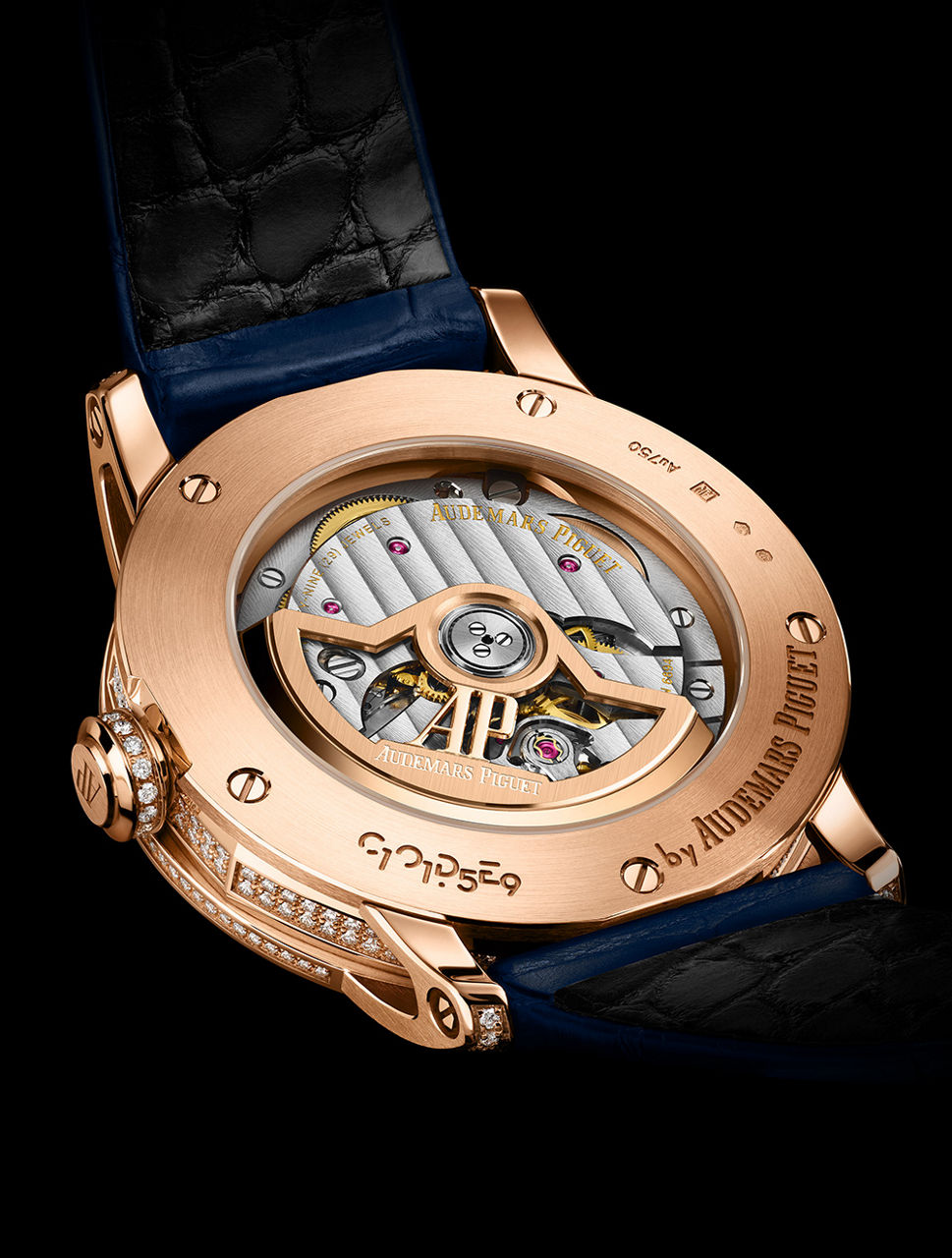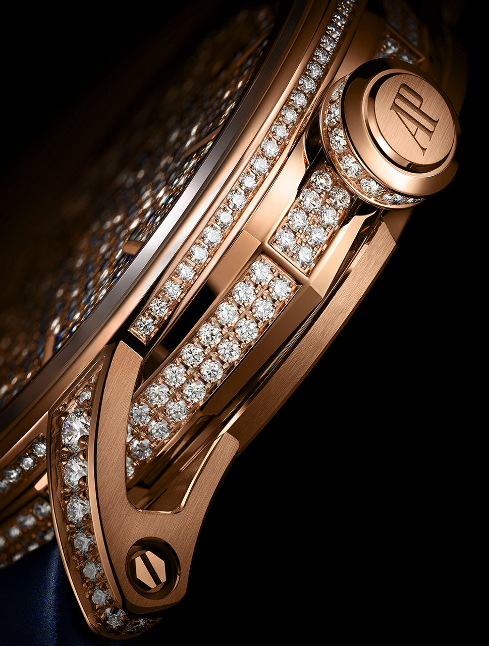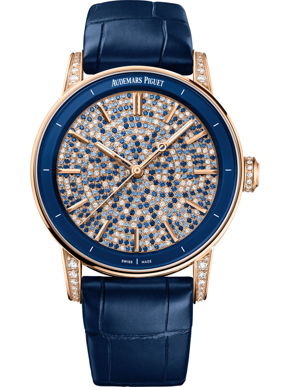 This 38 mm timepiece in 18-carat pink gold offers a contemporary two-tone aesthetic. While the case is set with brilliant-cut diamonds, the dial combines over 500 diamonds and blue sapphires. A blue inner bezel and a matching alligator strap complete the design.