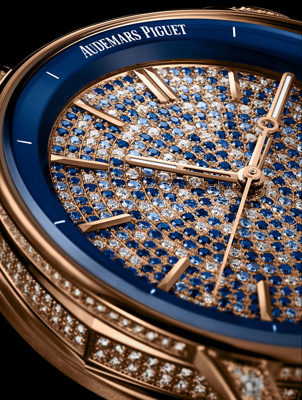 Dial set with brilliant-cut blue sapphires and diamonds, pink gold applied hour-markers, pink gold hands with luminescent coating, blue inner bezel.