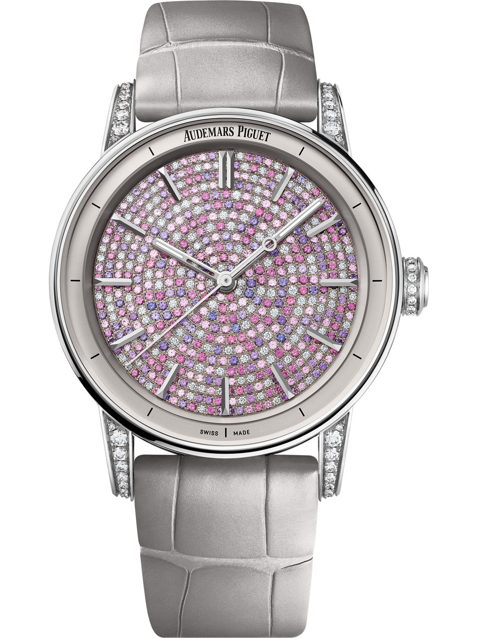 Dial set with brilliant-cut pink sapphires and diamonds, white gold applied hour-markers, white gold hands with luminescent coating, rhodium-toned inner bezel.
