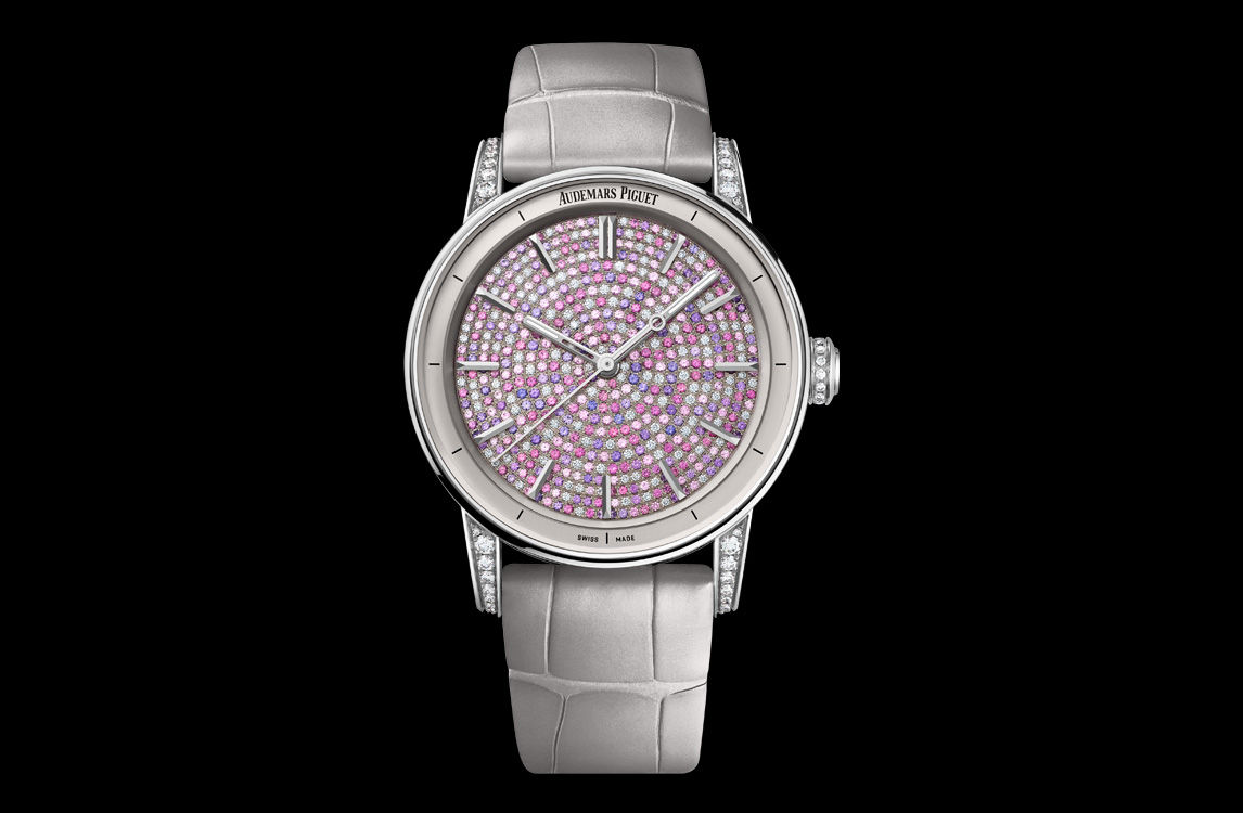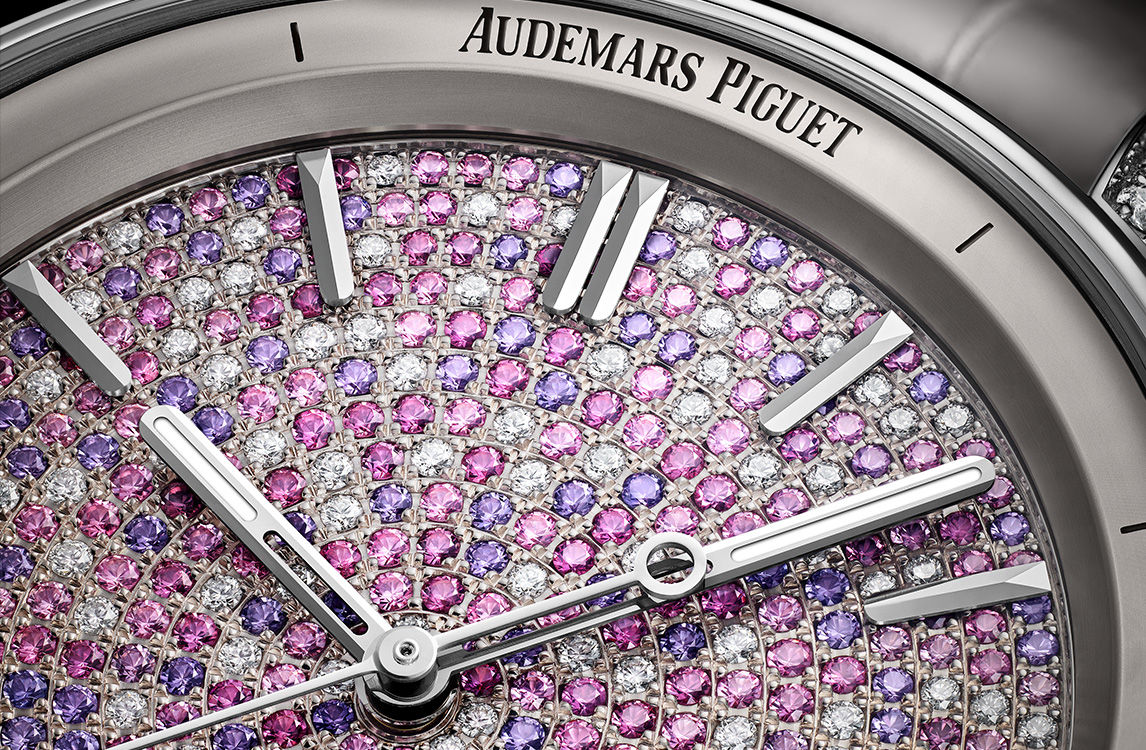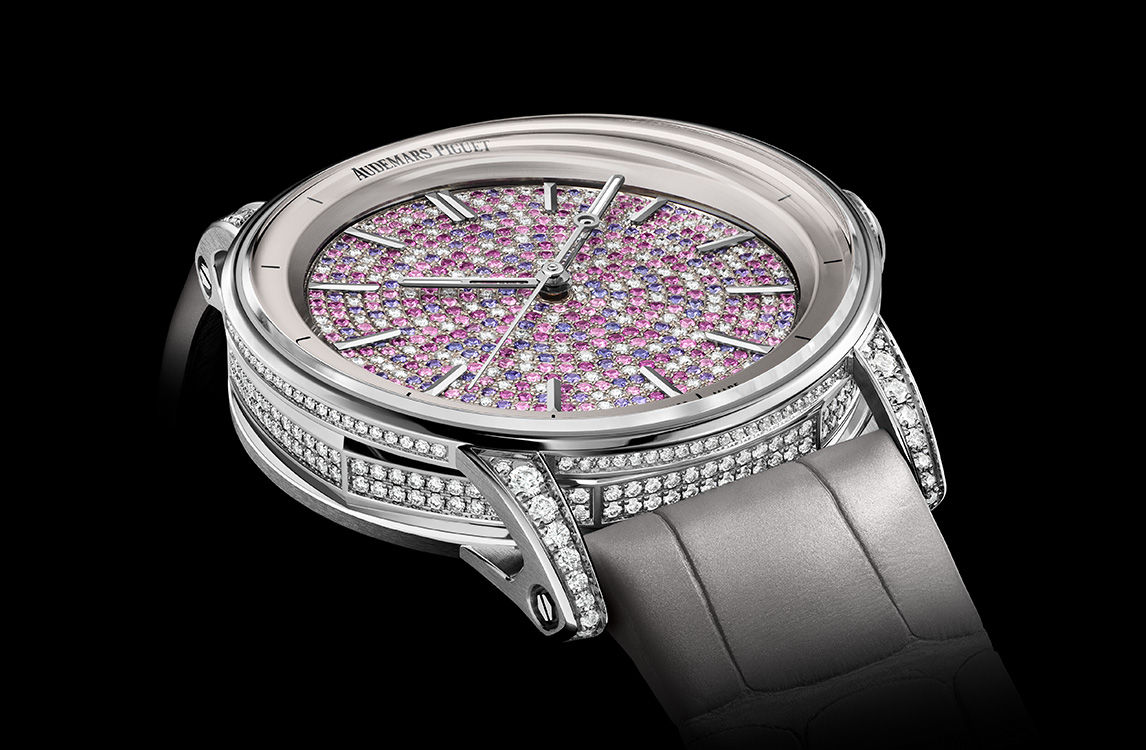 While the 38 mm case in 18-carat white gold sparkles with brilliant-cut diamonds, more than 500 brilliant-cut pink sapphires and diamonds in two different sizes are randomly combined on the dial to create a unique two-tone shimmering effect.