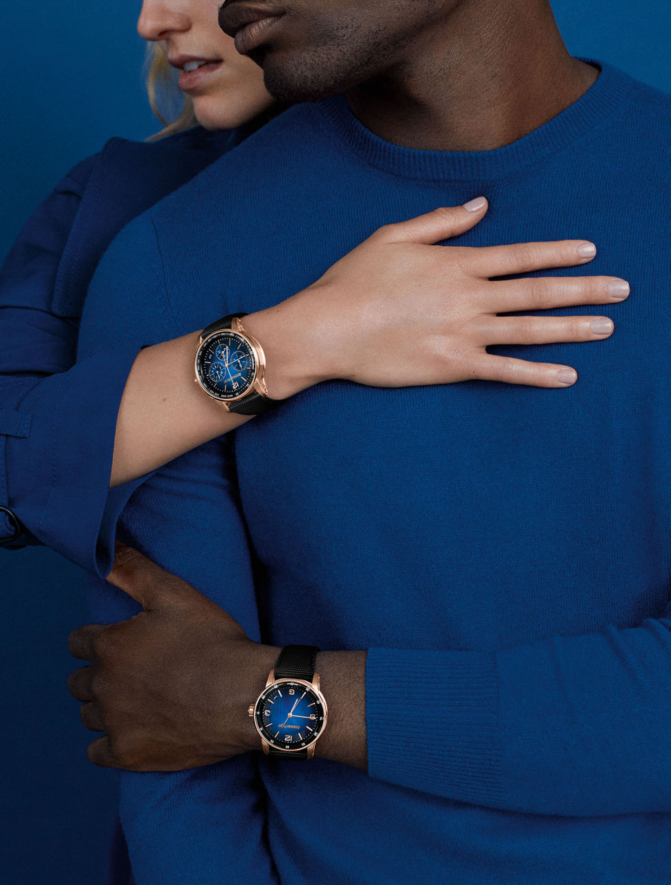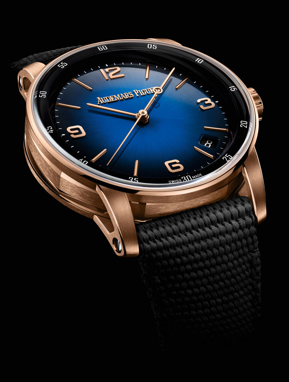 The 18-carat pink gold case is enhanced by a smoked blue lacquered dial with sunburst effect.