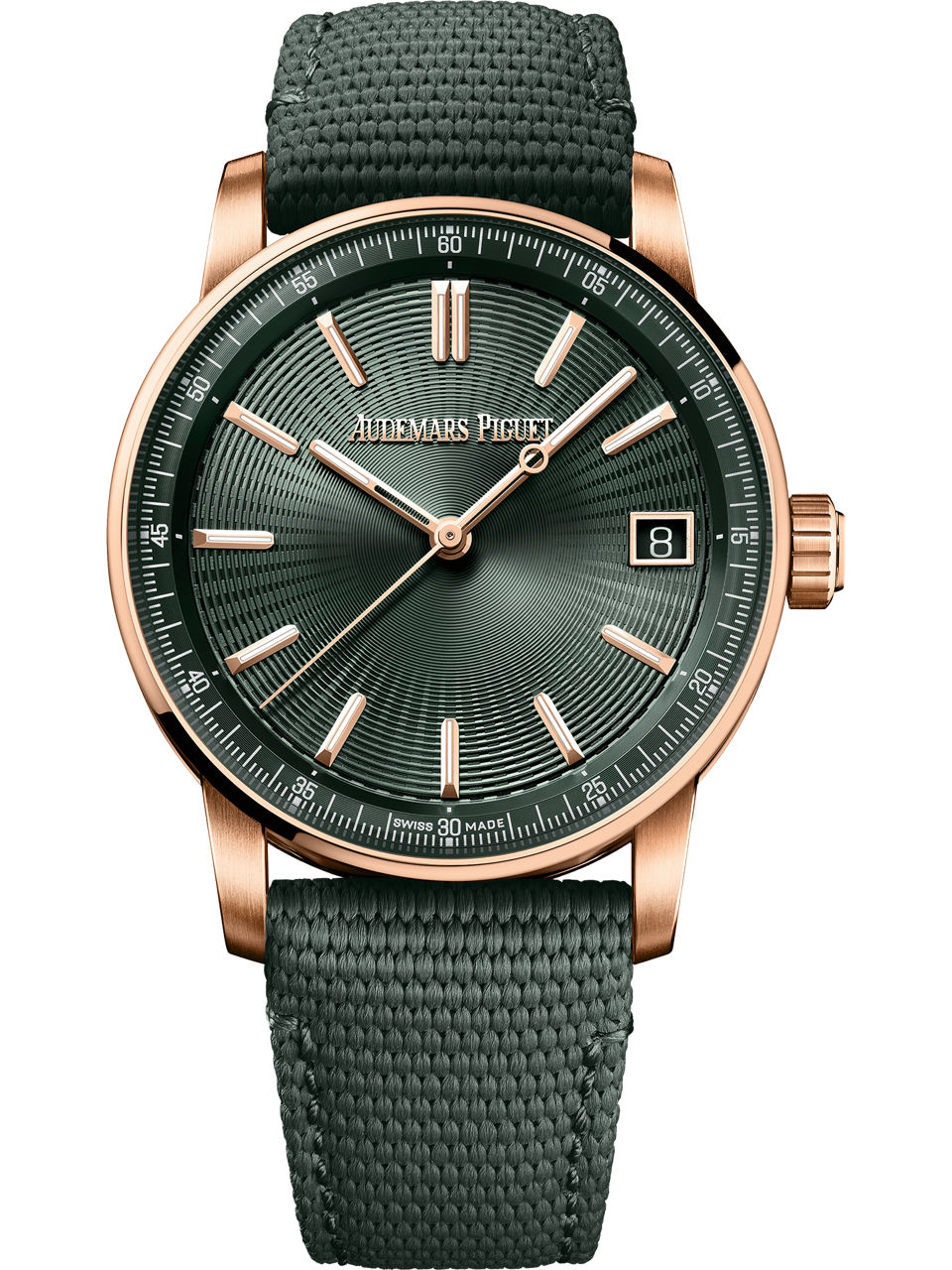 The 18-carat pink gold case combines with the collection’s new green embossed dial and matching rubber-coated strap for a timelessly elegant look.