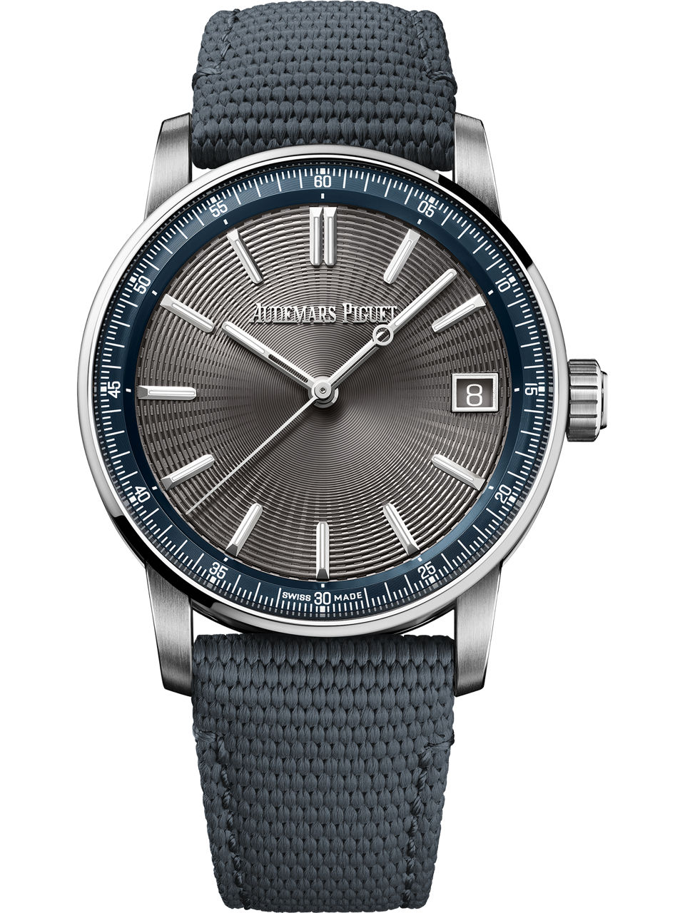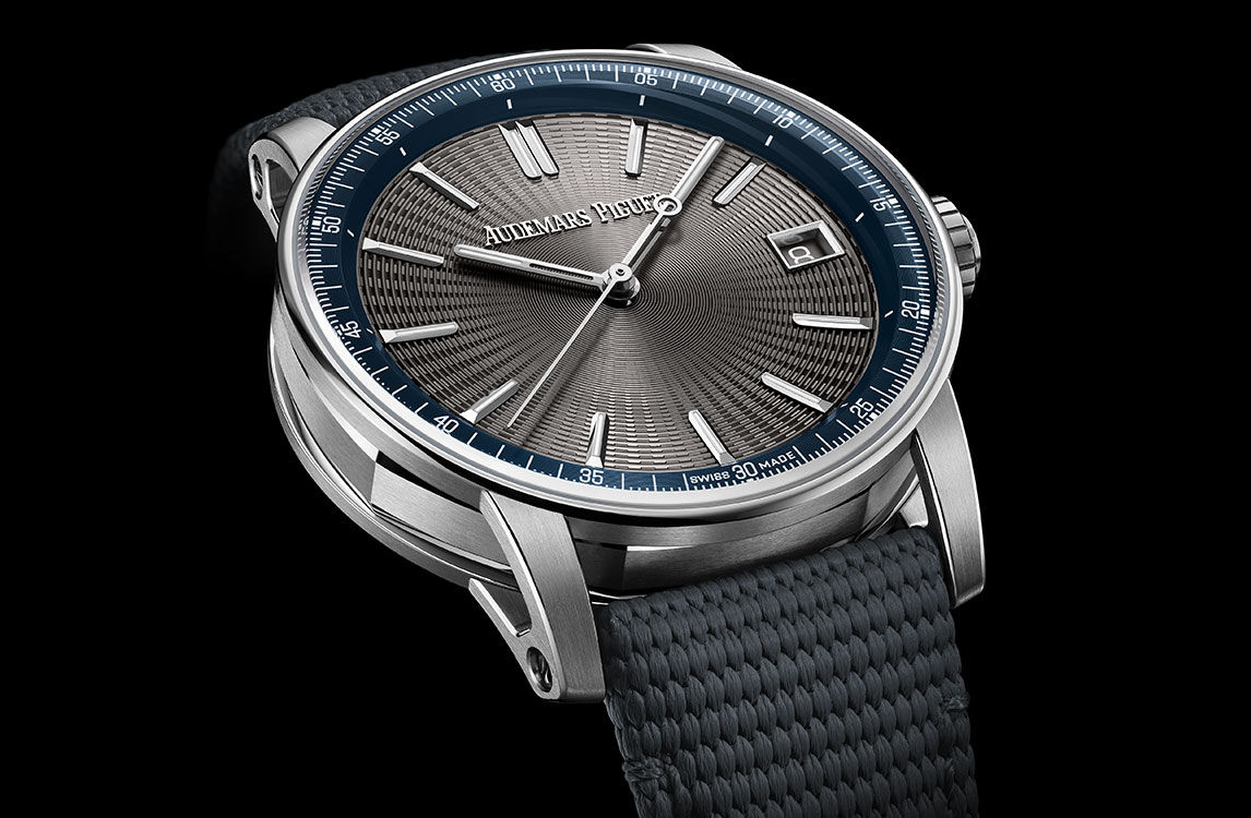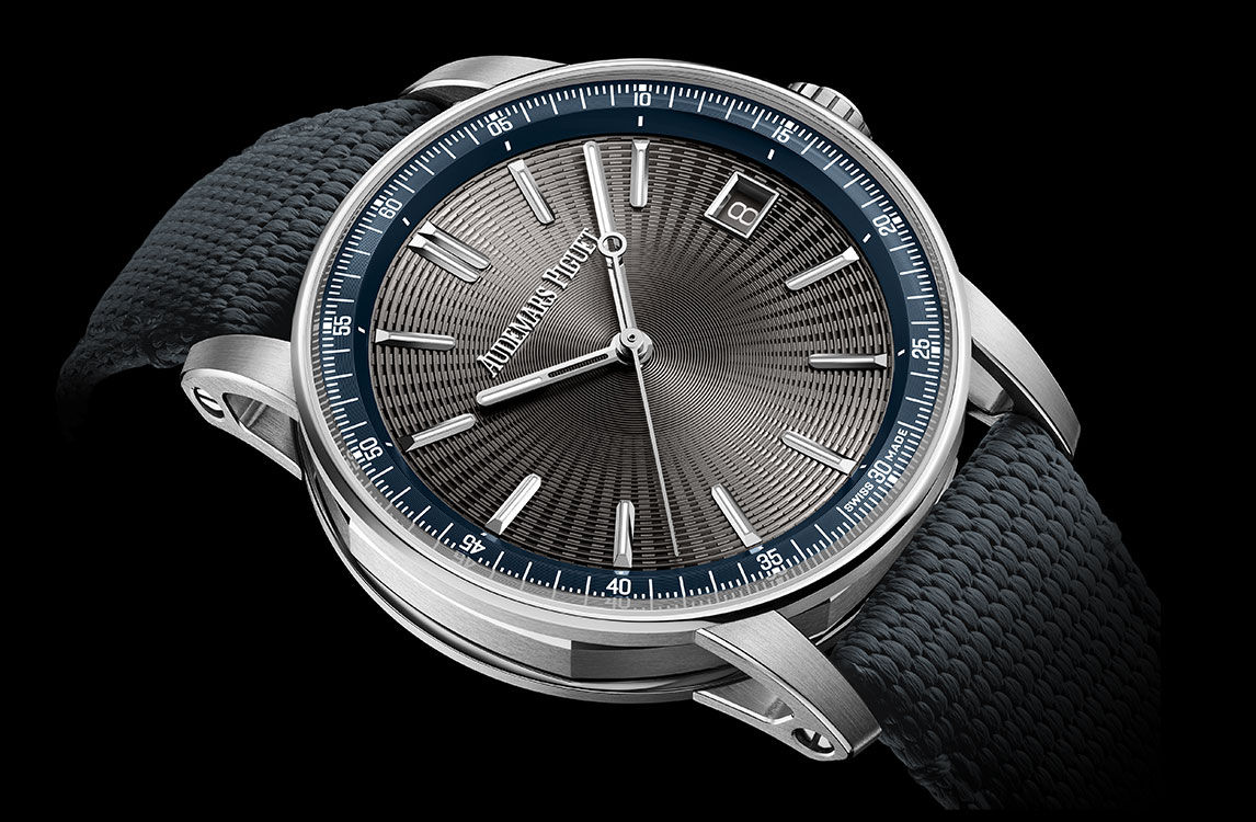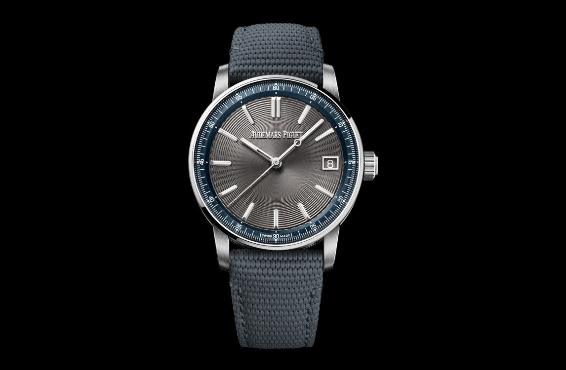 The grey embossed dial is complemented by a blue inner bezel and adorned with 18-carat white gold hour-markers and hands filled with luminescent material.