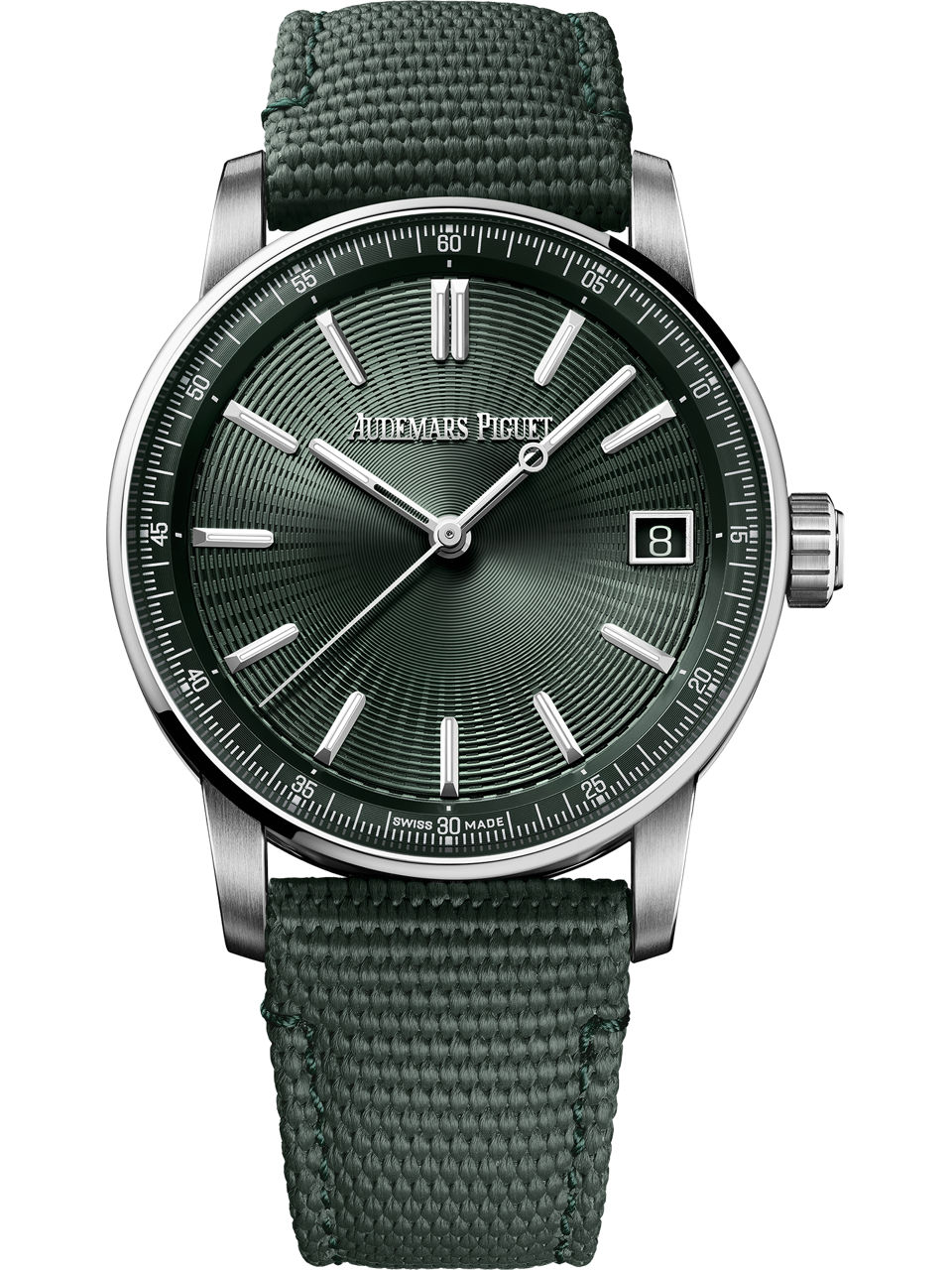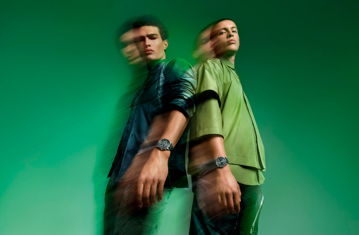 Green dial, white gold hour-markers and hands with luminescent coating, green inner bezel.