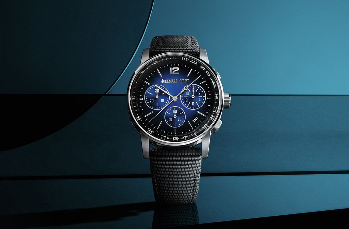 The Code 11.59 by Audemars Piguet Selfwinding Chronograph, powered by Calibre 4401, adorns an 18-carat white gold case enriched with a smoked blue sunburst lacquered dial.