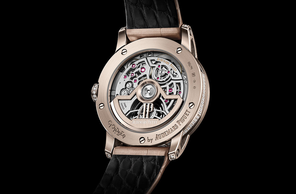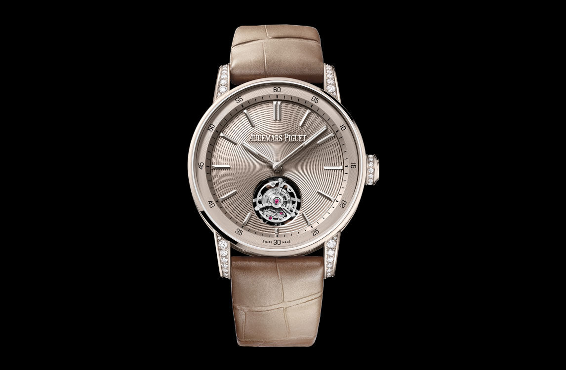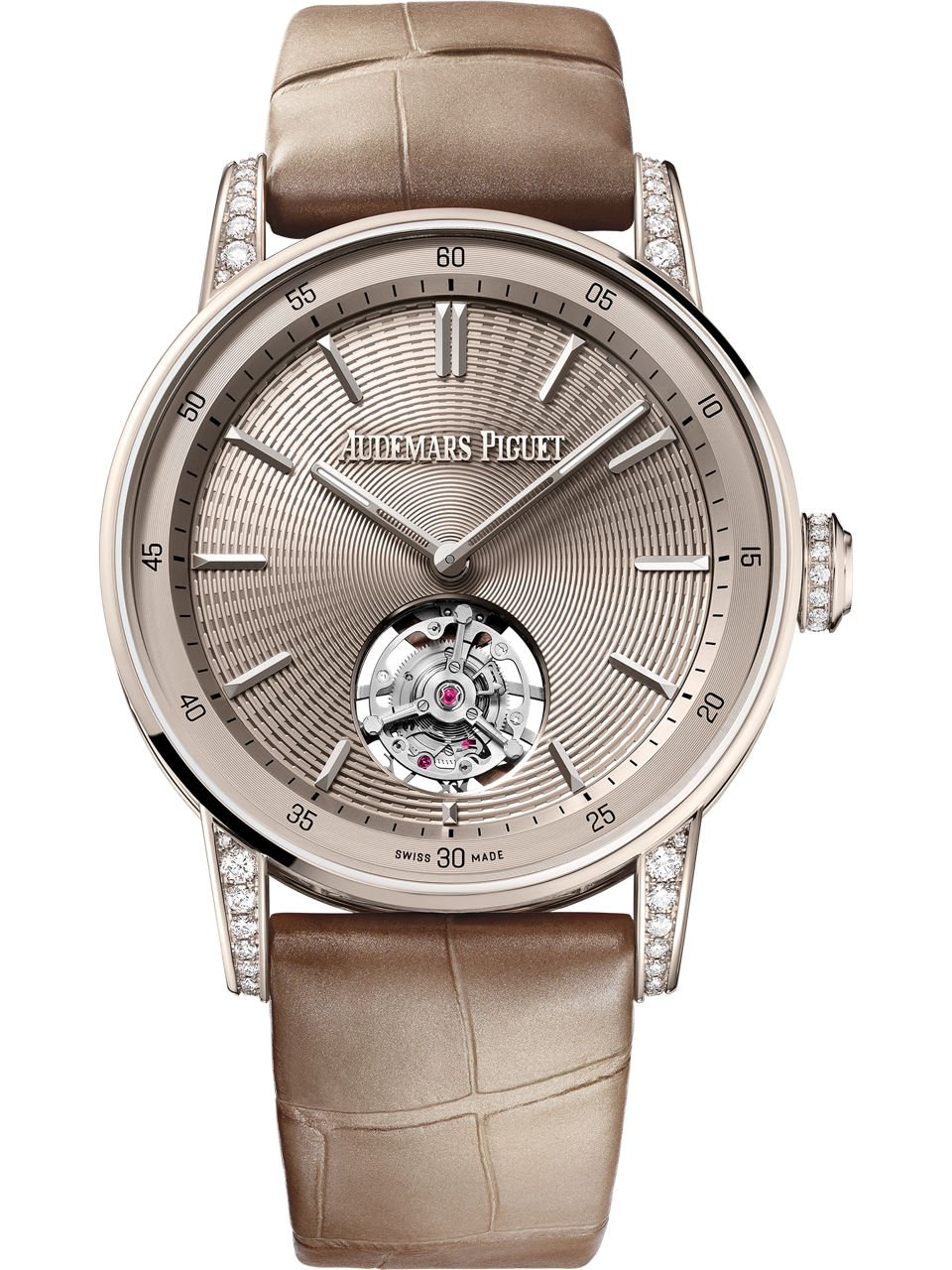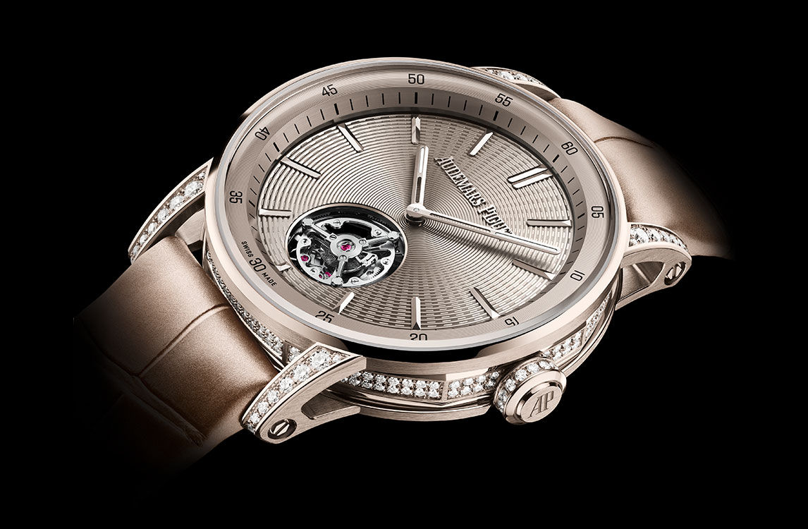 The beige alligator strap is fitted with an 18-carat sand gold AP folding clasp.